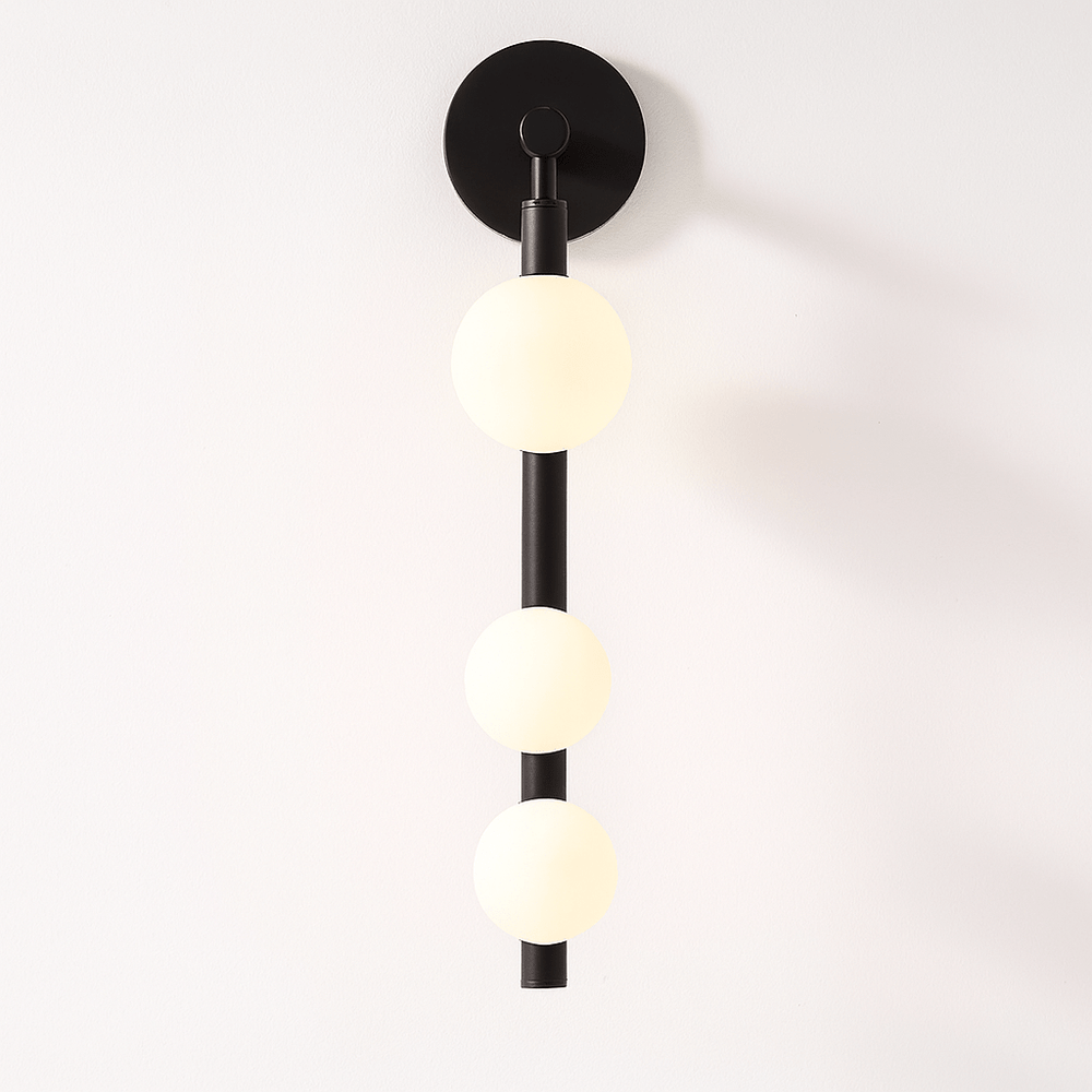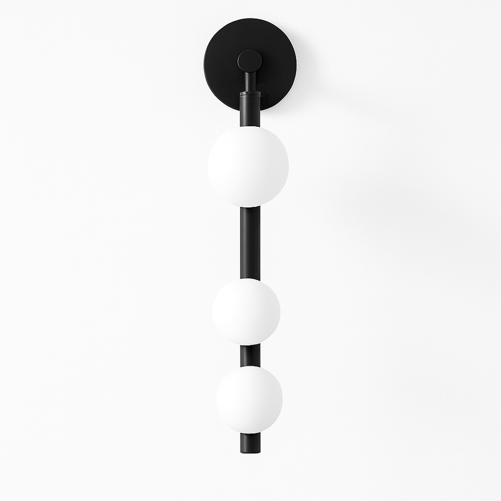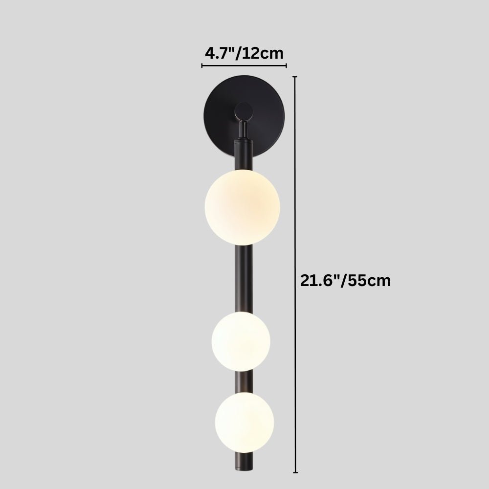The Orbos Wall Lamp is a modern light fixture crafted from durable metal with three frosted spherical glass shades for soft, diffused lighting. Its gold-tone vertical frame adds a striking contrast, making it a statement piece for hallways, bedrooms, living rooms, or accent walls. Blending functionality with artistic elegance, it's ideal for contemporary and minimalist interiors.