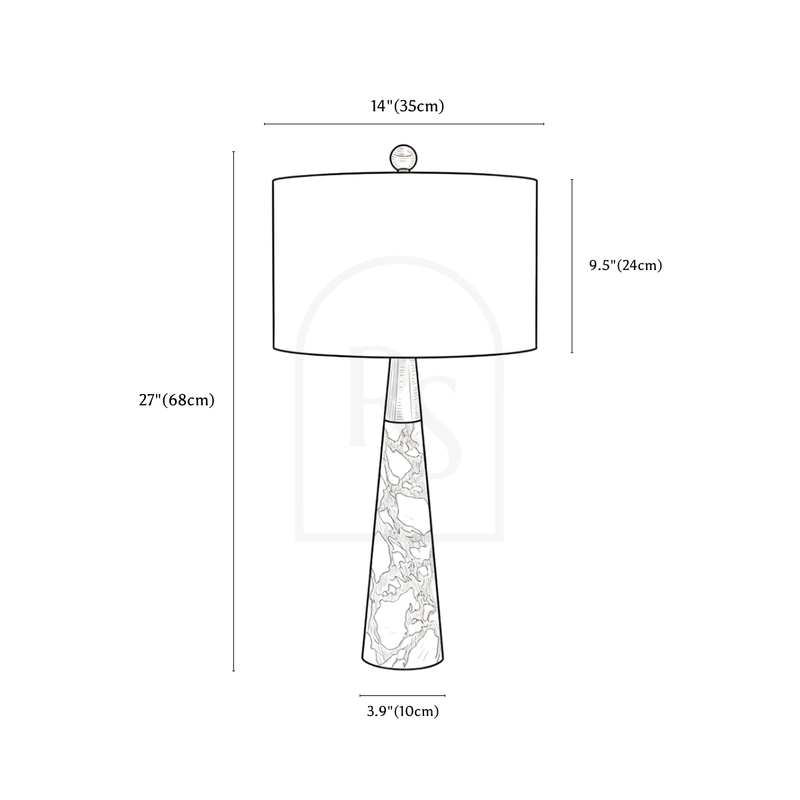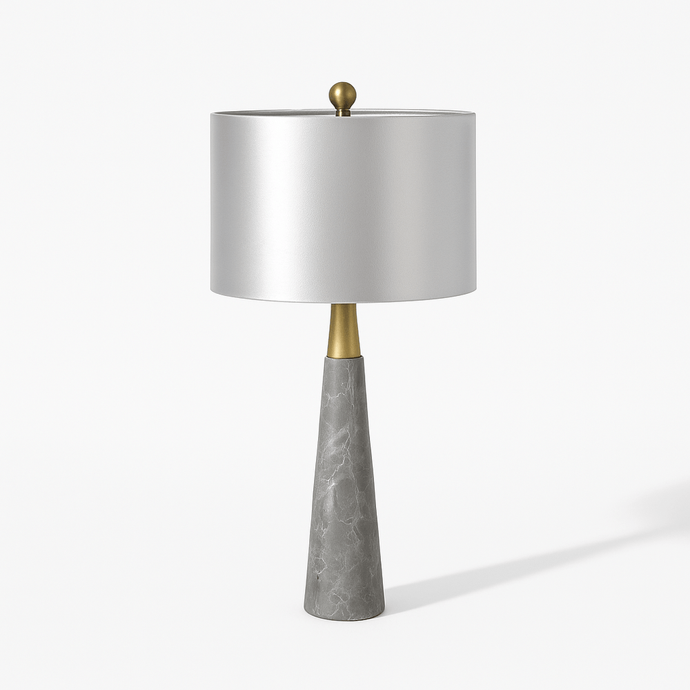 The Pelane table lamp is a refined light fixture that blends modern elegance with organic textures. Its conical marble base showcases intricate natural veining, paired with a sleek metal accent for a sophisticated touch. The fabric lampshade softens the illumination, creating a warm and inviting atmosphere. Ideal for bedside tables, living rooms, or office desks, this table lamp enhances contemporary and classic interiors alike. Designed for both aesthetics and functionality, it adds a statement of luxury while providing ambient lighting for any space.