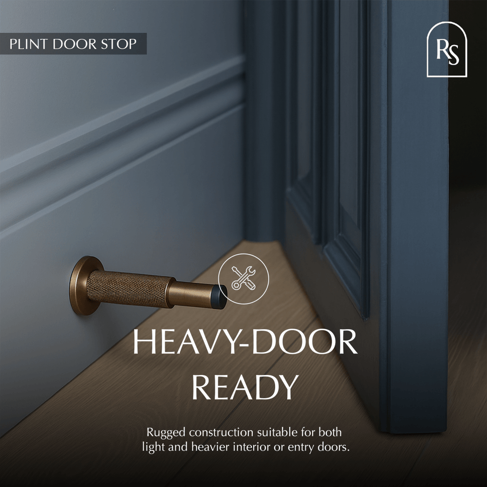 The Plint Door Stop is a solid brass stopper with a knurled cylindrical design for superior grip and a sleek, minimal profile. Its rubber-capped tip safeguards doors and walls from impact, ensuring long-lasting durability. Suitable for wall or floor mounting, it complements modern, industrial, and transitional interiors in homes, offices, or commercial spaces.