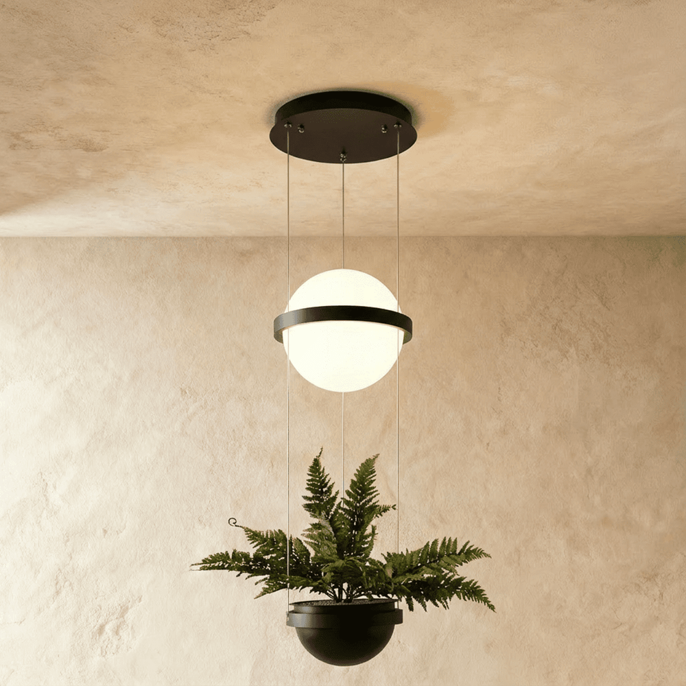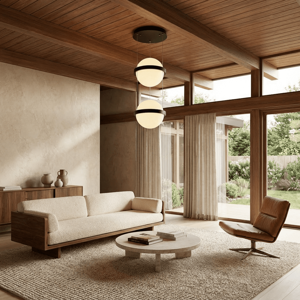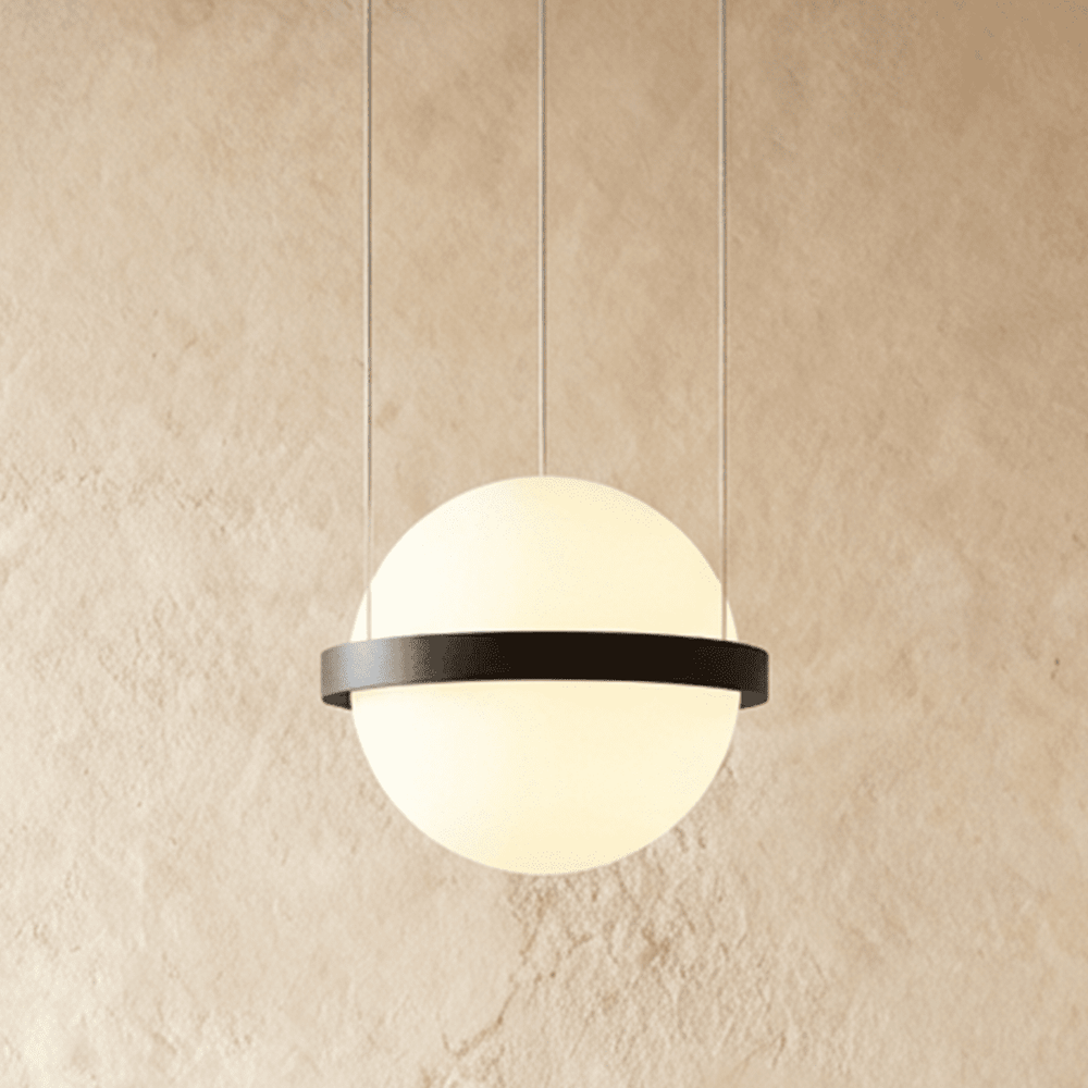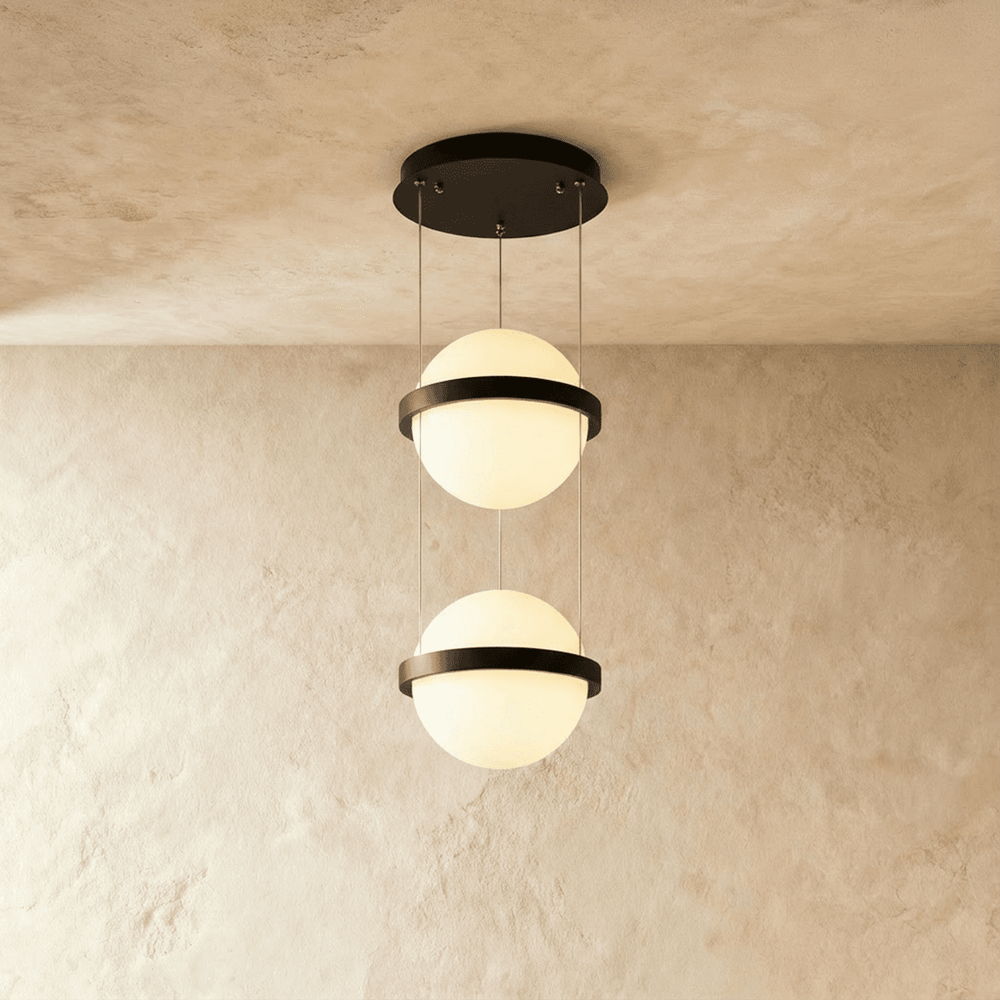 Ratina Pendant Light is a modern pendant light fixture with a sculptural, minimalist design. Featuring spherical frosted glass diffusers encased in sleek iron bands, it creates soft, ambient lighting. Suspended by thin cables, its floating effect enhances contemporary interiors. Ideal for dining areas, living rooms, stairwells, and high ceilings, this pendant light fixture adds a striking visual statement while providing functional illumination.
