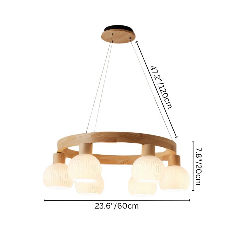 Circular wood frame with ribbed glass globes offers soft, ambient lighting — perfect for enhancing dining rooms, kitchens, and living spaces with modern elegance.