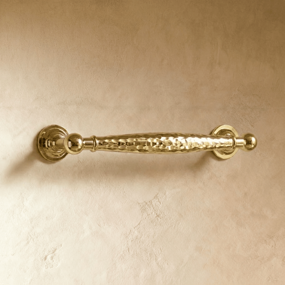 Machined from solid brass with a hammered, faceted surface that catches light and adds texture to cabinet and drawer fronts.