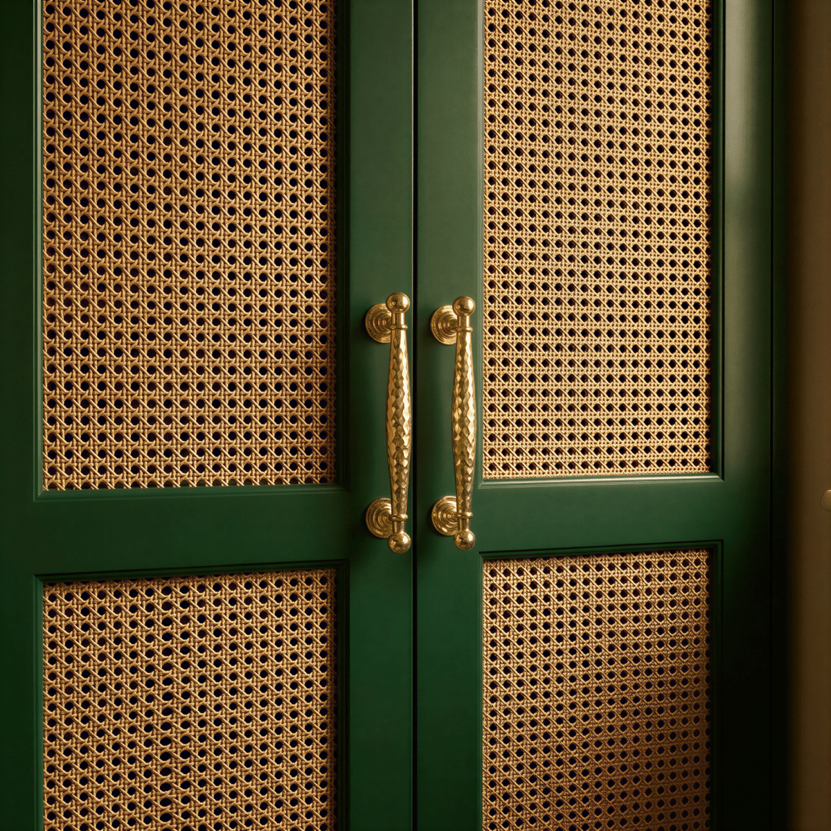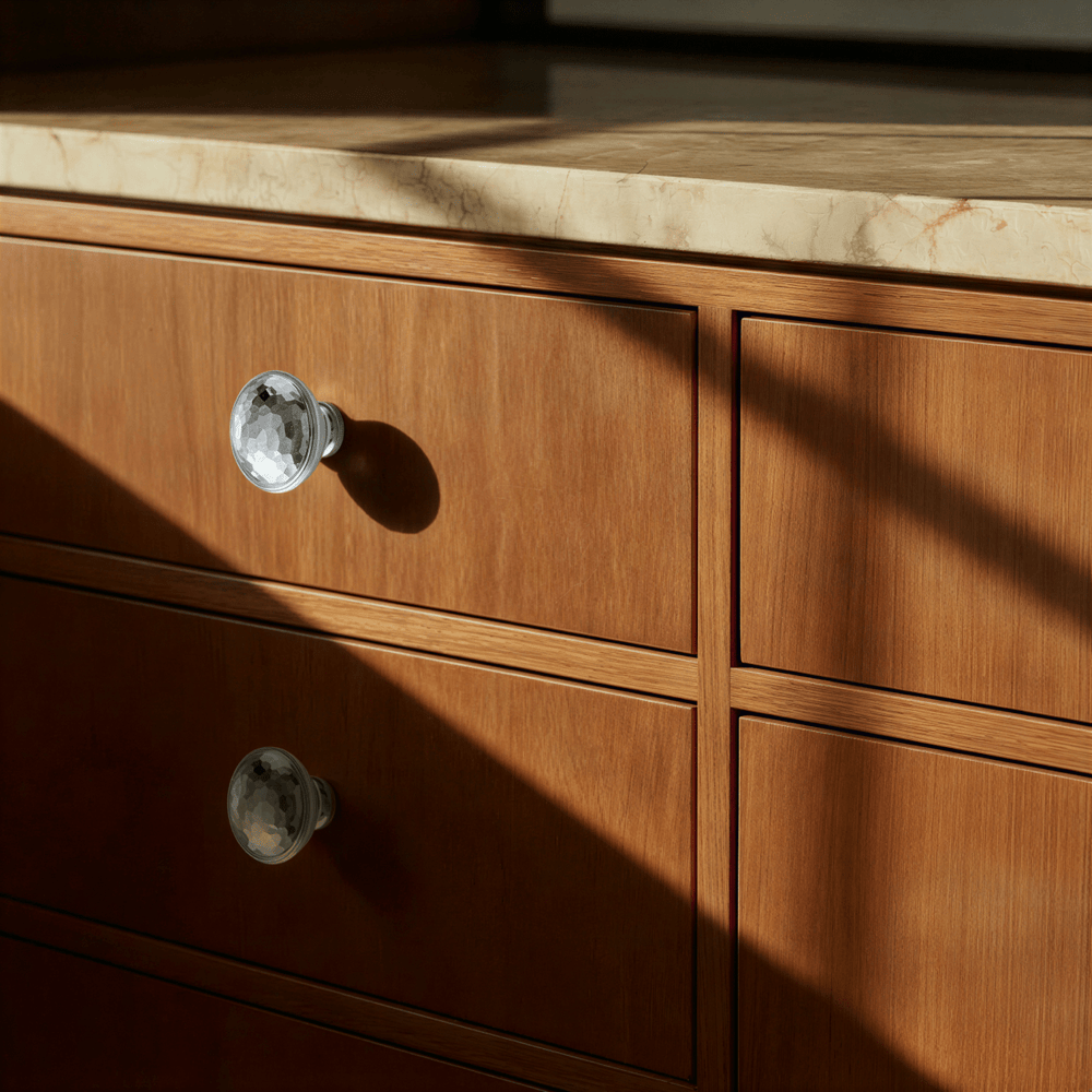 The Regis Brass Knob & Pull Bar introduces texture and quiet character to cabinetry through carefully machined solid brass. Its faceted surface breaks light into small highlights, creating a subtle shimmer that shifts as the room moves around it.