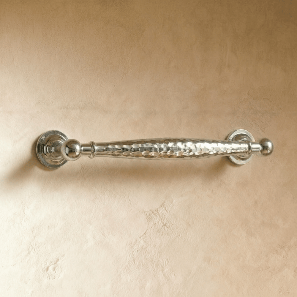 • The faceted hammered surface catches and scatters light across cabinetry.