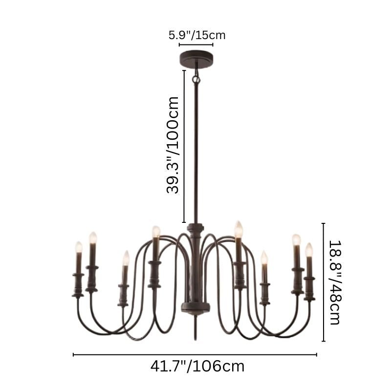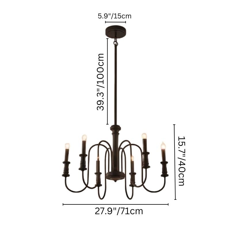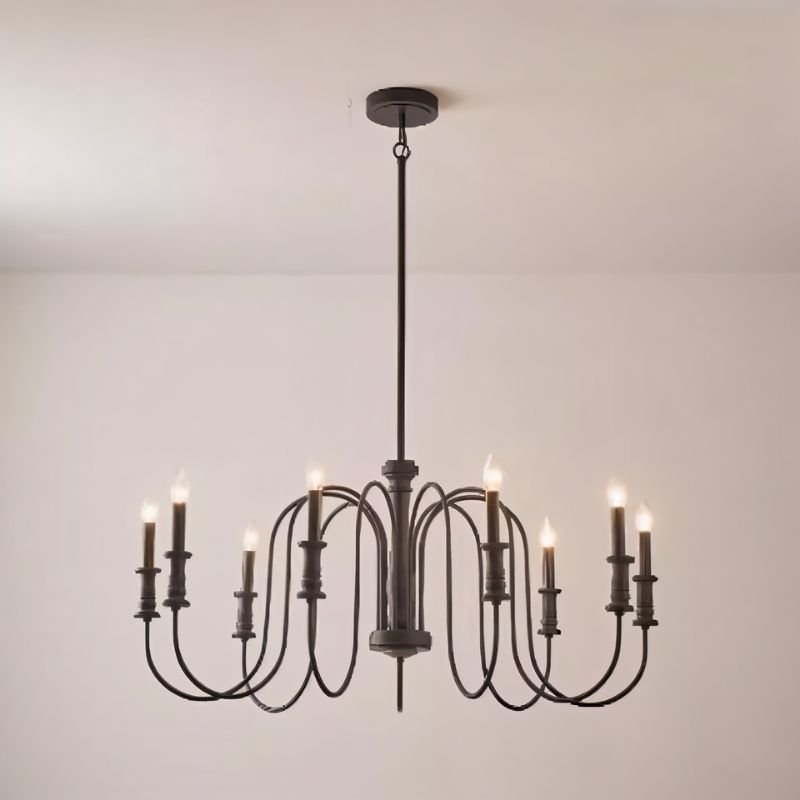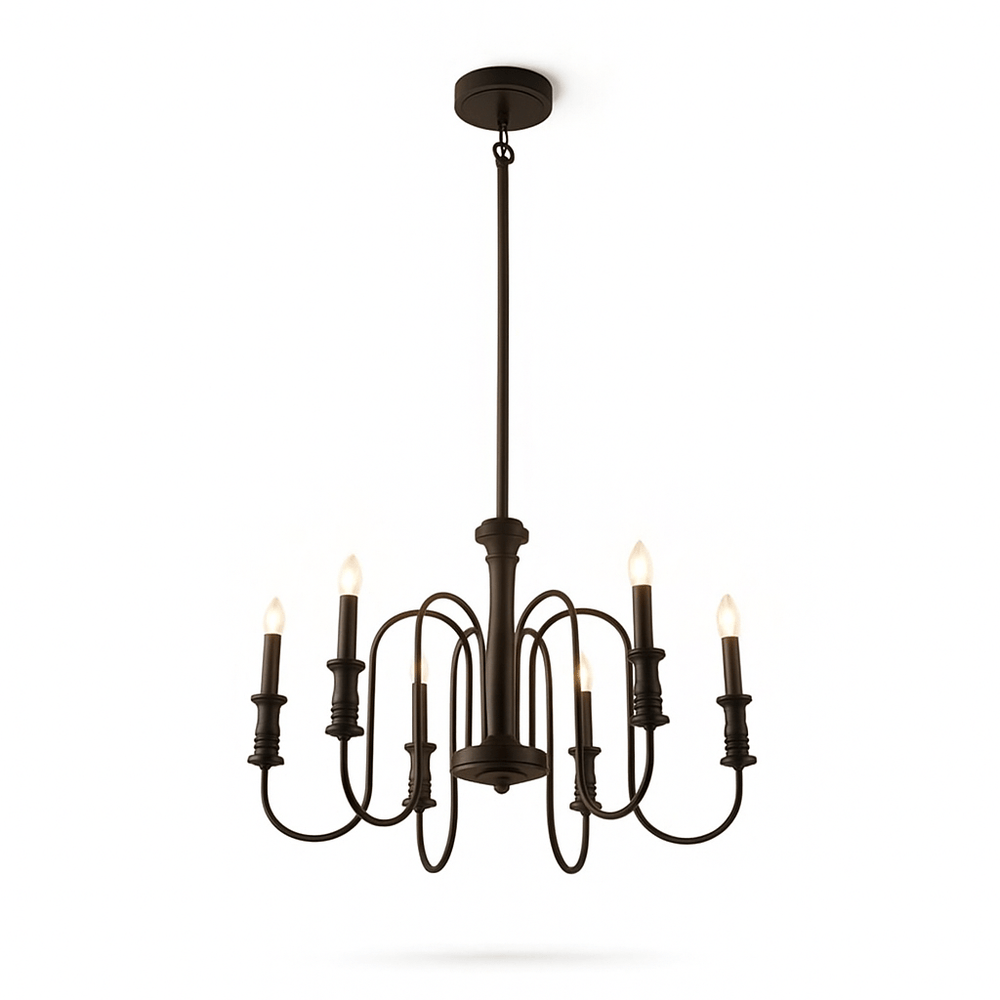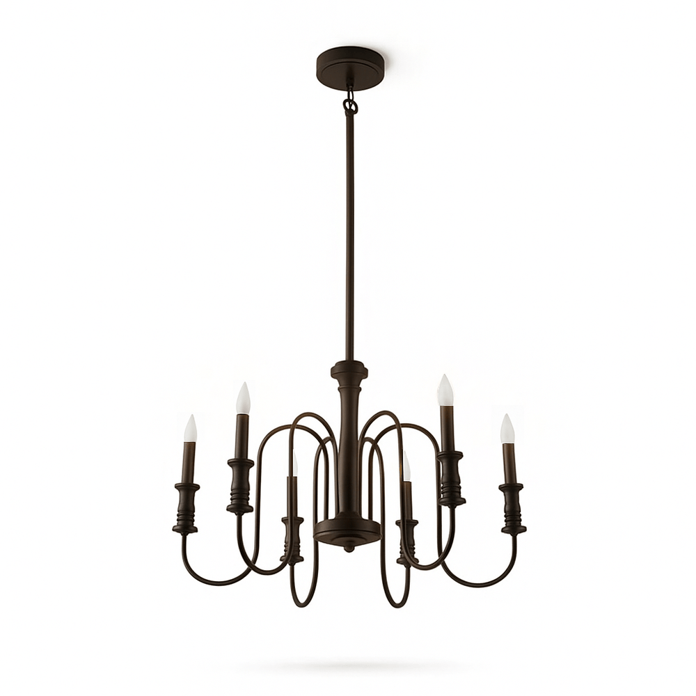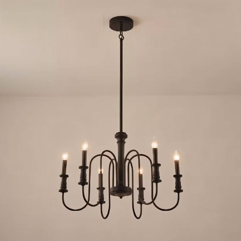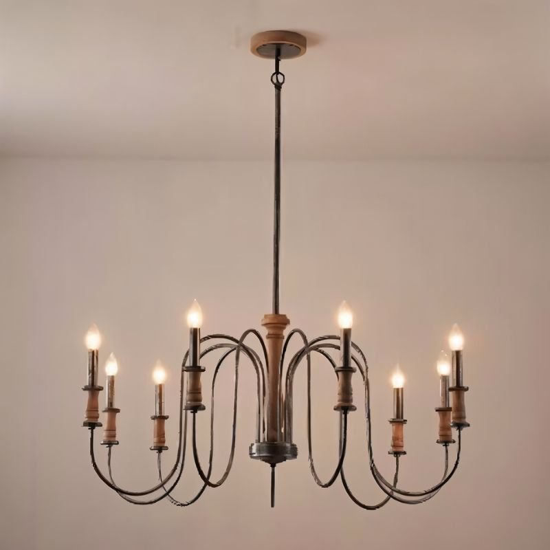 The Reni Chandelier is a rustic light fixture crafted from iron and wood, featuring gracefully curved metal arms and candle-style holders for a timeless silhouette. The combination of dark iron and natural wood accents enhances its vintage appeal, Designed for dining rooms, living spaces, and entryways, this statement light fixture provides warm, ambient illumination while adding character to any setting. Its sturdy construction and classic design make it a perfect choice for homes seeking a refined yet rustic aesthetic.