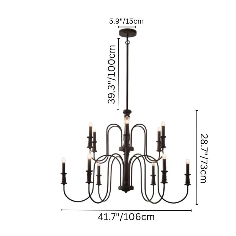 Product Dimensions: 6 Heads : 15.7" x 27.9" / 40 x 71cm / 30W, 9 Heads : 18.8" x 41.7" / 48 x 106cm / 45W, 12 Heads : 28.7" x 41.7" / 73 x 106cm / 60W Weight: 4.5Kg, 5.8Kg, 7.5Kg Material: Iron, Wood Finish: Wood, Black Light Source: LED Light Bulb (Replaceable) Bulb Included: Yes Number of Bulbs: 6, 9, 12 Bulb Base: E14 Dimmable: Upon Request Wattage: 30W, 45W, 60W Lumens: 100 lm/W Voltage: 90-260VAC Installation Type: Pipe Erected Chain/Cord Length: Up to 3.3ft (1 meter) Adjustable Cord: No Canopy/Backplate Dimensions: 5.9" / 15cm Sloped Ceiling Compatible?: Yes Certifications: UL, CCC, CE, CQC, EMC, FCC, GS, LVD, PSE, ROHS, SAA, and VDE