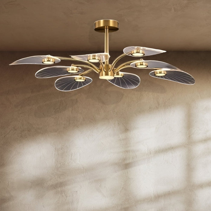 The Rotasu Chandelier offers a modern, stylish alternative to traditional lighting fixtures with its semi-flush design, lotus-leaf-shaped acrylic lampshades, and electroplated gold finish. It provides targeted lighting and a chic aesthetic, unlike conventional lights that sit flush against the ceiling and evenly light a room.