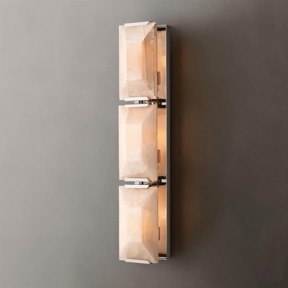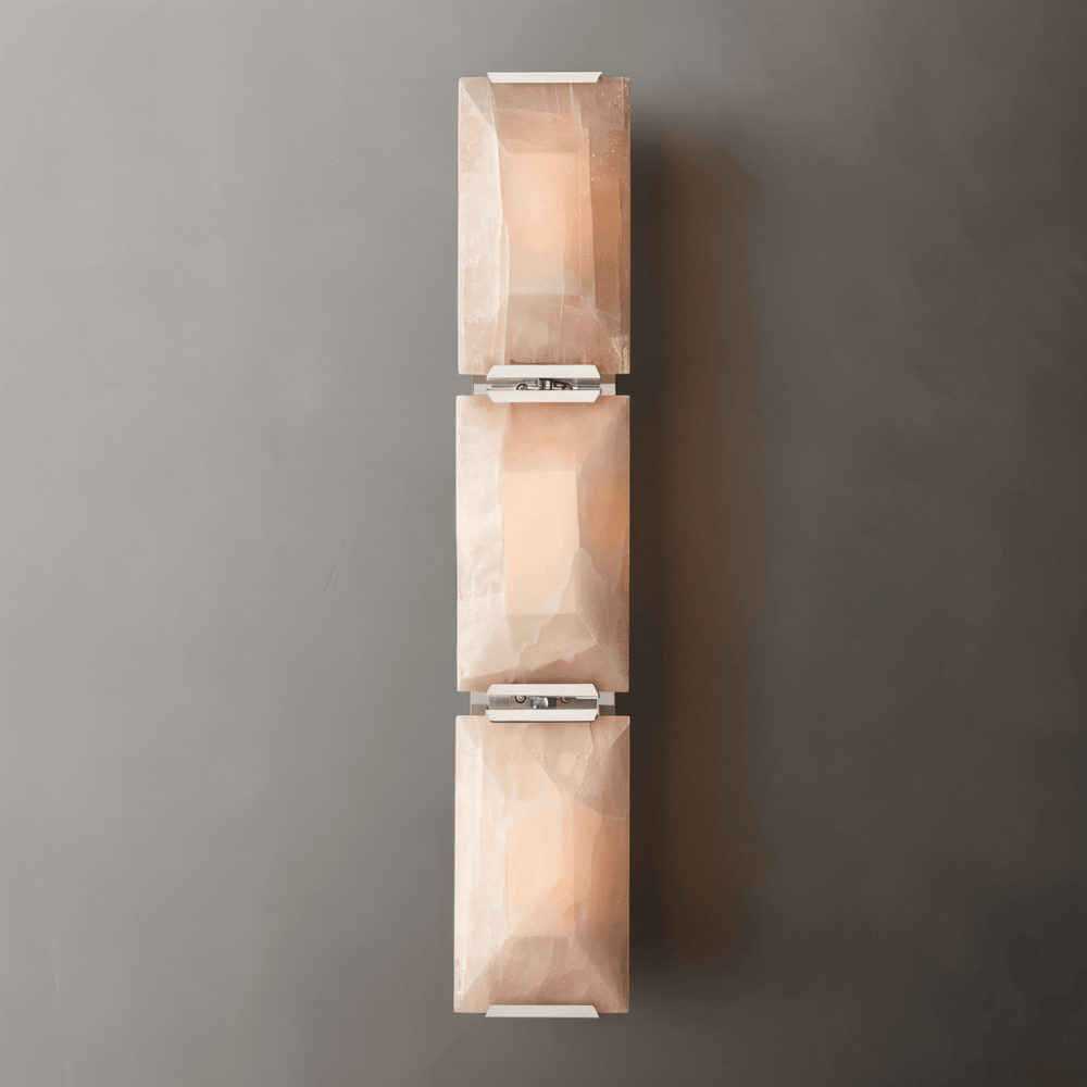 The Sakhra Wall Lamp is a striking modern light fixture that combines the raw elegance of alabaster stone with the sleek precision of metal craftsmanship. Its geometric, faceted stone panels refract light beautifully, casting a warm, refined glow across any wall. Ideal for hallways, living areas, or sophisticated hospitality interiors, this wall-mounted design transforms spaces with its balance of texture, geometry, and contemporary luxury.