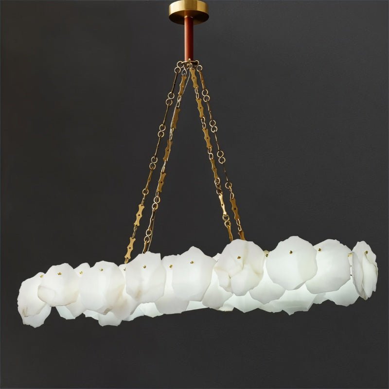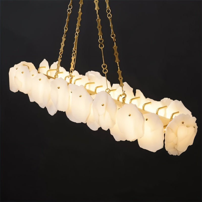 The chandelier is meticulously designed with a sturdy metal frame embracing translucent alabaster panels. The alabaster, known for its luxurious appearance, adds sophistication. When lit, it creates a warm glow, casting a soft ambiance in the room.