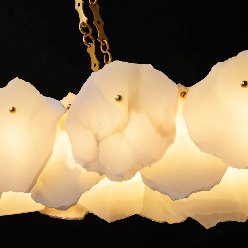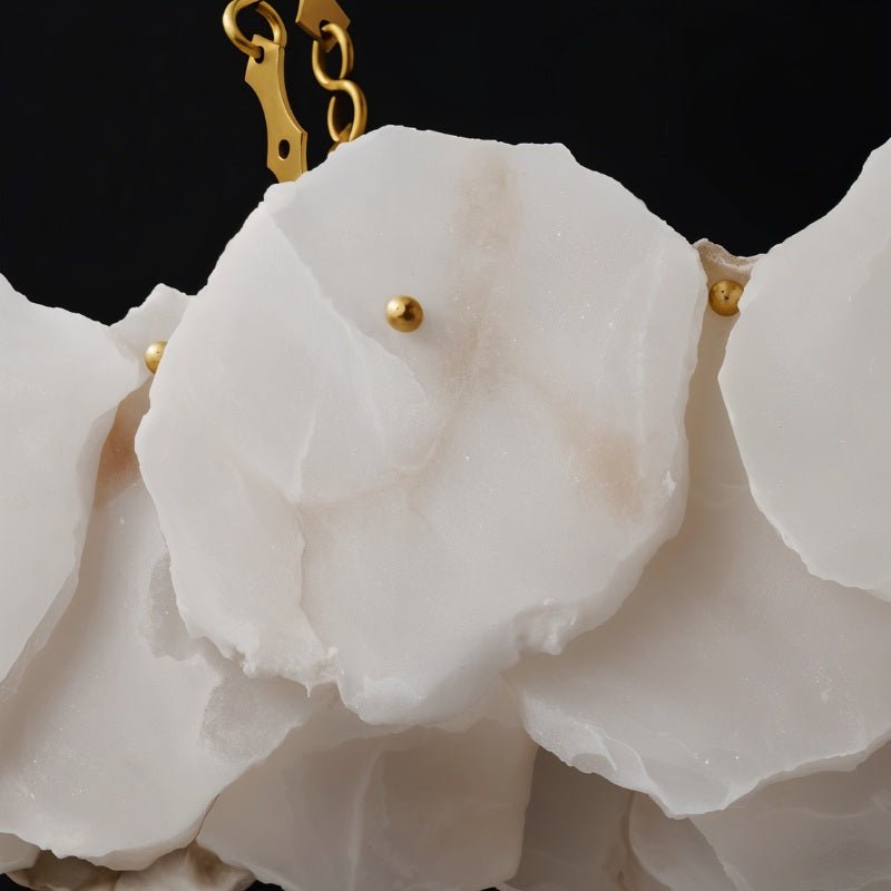 The Shatkon Alabaster Chandelier Light is constructed with a robust metal frame that embraces luxurious translucent alabaster panels. For the best installation experience, we recommend hiring a professional installer.