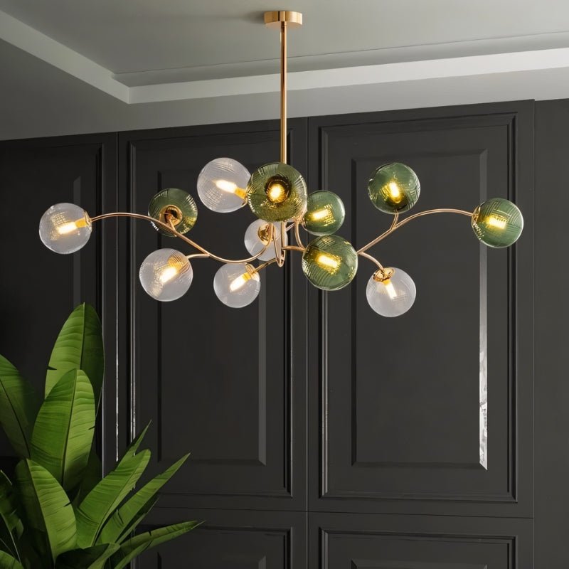 Brass-finished arms and crystal glass globes in green and clear tones exude luxury.