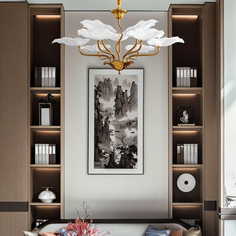 - Sculptural light fixtures with petal-like shades create an artistic statement piece.