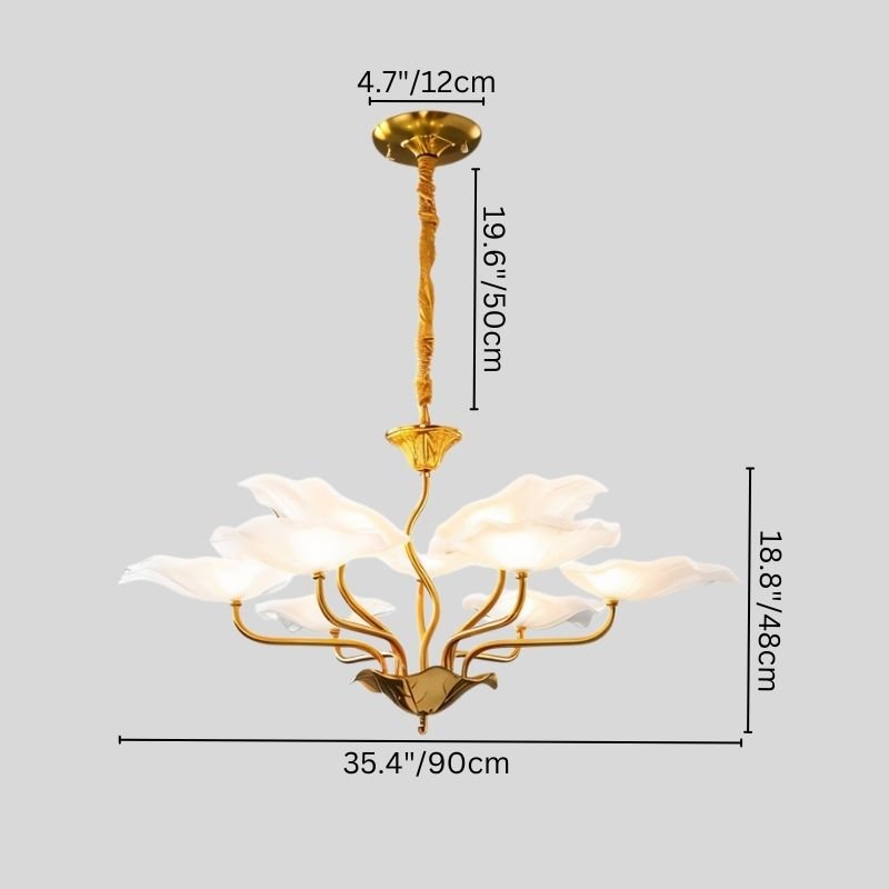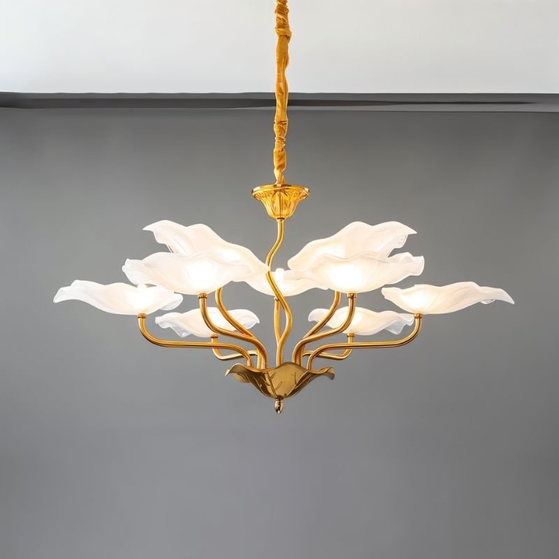 The Skira Chandelier is a sculptural light fixture with petal-like shades that diffuse light softly while creating a striking visual effect. Crafted from iron and plastic, its gold-finished frame enhances its luxurious appeal, making it ideal for dining rooms, living spaces, and upscale commercial interiors. Designed for ambient illumination, this statement piece blends organic elegance with modern sophistication. Its artistic form and balanced symmetry complement both contemporary and classic decor.