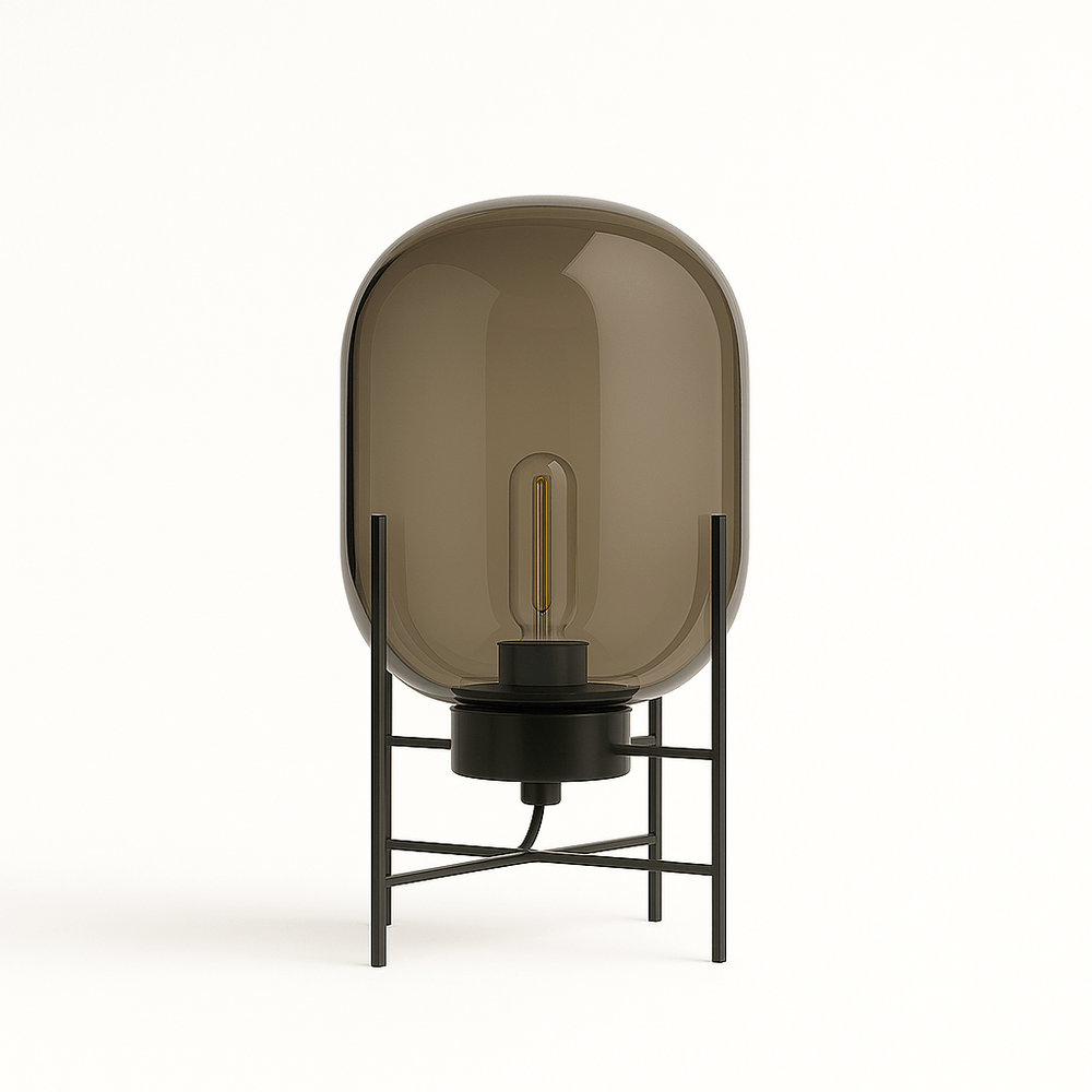 Skynra Table Lamp features a stylish amber or smoky gray glass shade, paired with a sleek black iron frame. The minimalist design of the glass shade creates a warm, inviting glow, while the geometric iron base adds a modern touch to any space. This light fixture is ideal for placing on desks, nightstands, or side tables, offering both functional lighting and an elegant decorative accent. The combination of glass and iron materials ensures durability and sophistication, making it a perfect fit for contemporary interiors.