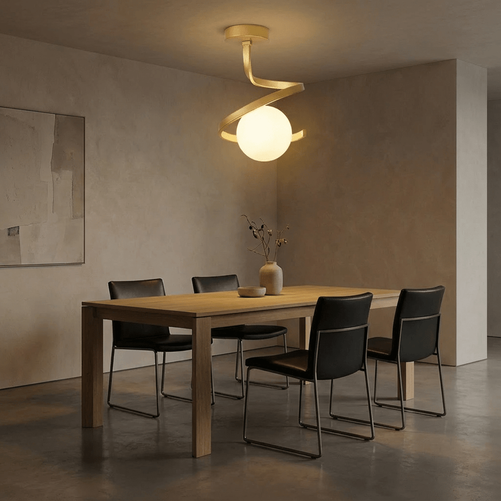 The Slym ceiling light is a striking light fixture featuring a sculptural spiral iron frame embracing a frosted glass globe. Its asymmetrical design creates a dynamic, modern aesthetic, casting soft, diffused illumination that enhances any contemporary space. The flush-mounted structure makes it ideal for hallways, bedrooms, and entryways, adding visual interest while maintaining a sleek, minimalist look. Crafted from durable iron and glass, this ceiling light blends elegance with functionality, making it a bold yet versatile lighting solution.