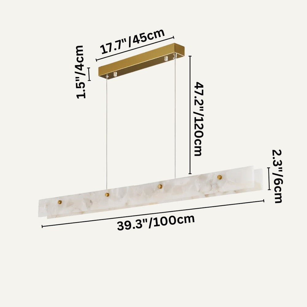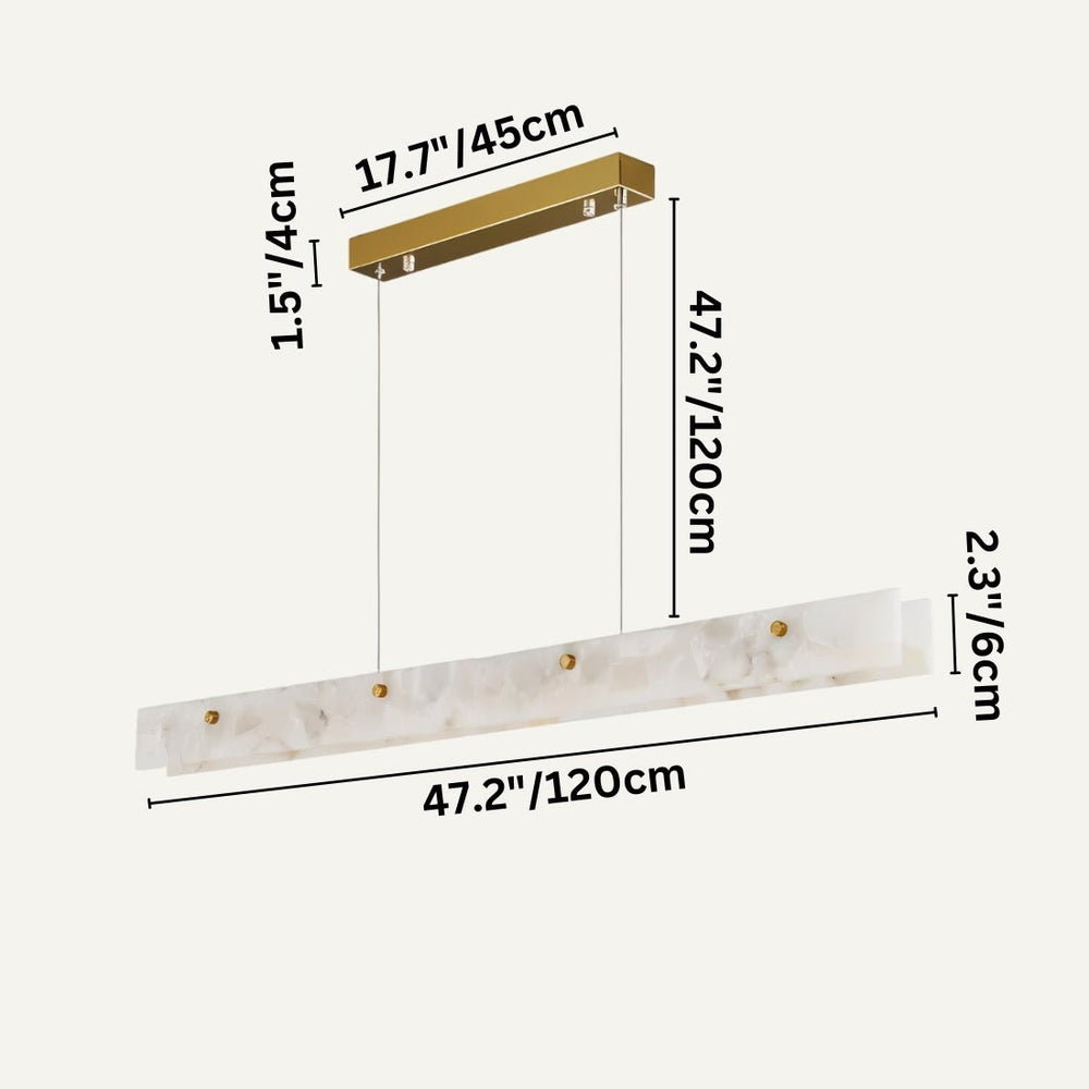 Product Dimensions: 2.3" x 39.3" / 6 x 100cm / 30W, 2.3" x 47.2" / 6 x 120cm / 40W Material: Copper, Alabaster Marble Finish: Polished Light Source: Integrated LED Dimmable: No Wattage: 30W, 40W Lumens: 100lm/watt Voltage: 90-260VAC Installation Type: Hardwired Chain/Cord Length: Up to 3.9ft (1.2 meter) Adjustable Cord: Yes Canopy/Backplate Dimensions: 17.7" / 45cm Sloped Ceiling Compatible?: No Certifications: UL, CCC, CE, CQC, EMC, FCC, GS, LVD, PSE, ROHS, SAA, and VDE