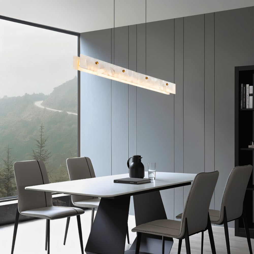 The Tath Chandelier features a stunning alabaster marble body paired with a copper-finished back plate, ensuring a luxurious and durable design.
