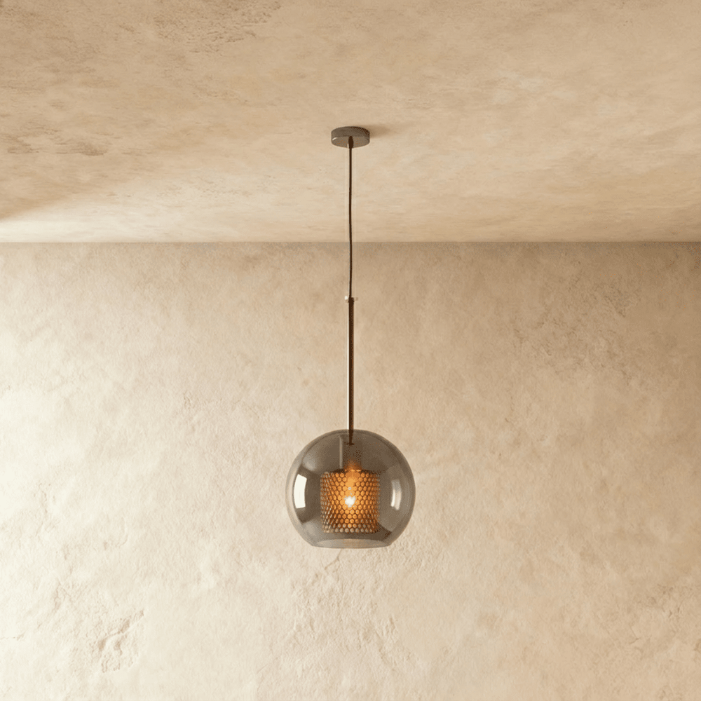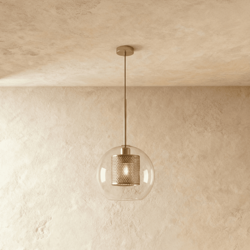 The Theia Pendant Light is crafted from high-quality clear glass and durable metal with a perforated metal interior.