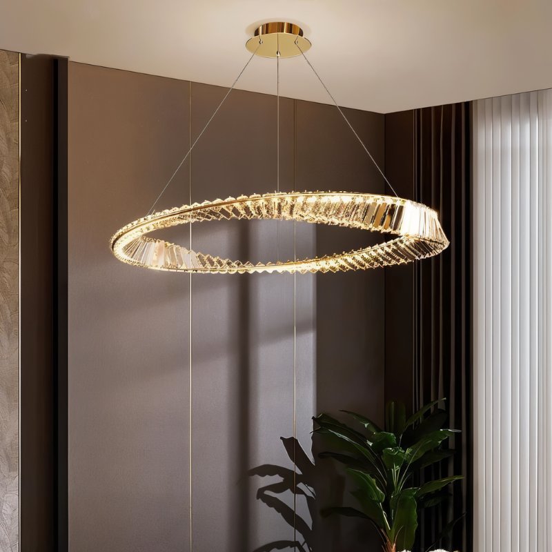 Metal rings and a crystal lampshade bring a refined, stylish look to any room.