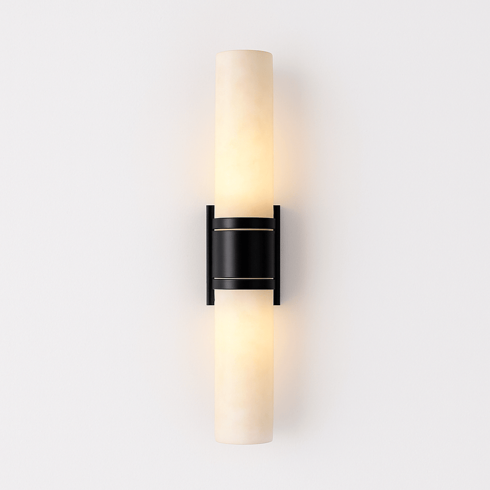 Trevix Wall Lamp combines marble and copper in a sleek, vertical design, casting a soft, diffused glow. The cylindrical light fixture features a contrasting black metal accent, enhancing its modern appeal. Ideal for bedrooms, hallways, or living spaces, it mounts seamlessly on walls for ambient or accent lighting. Available in two colors, this fixture blends luxury with functionality, making it a statement piece.