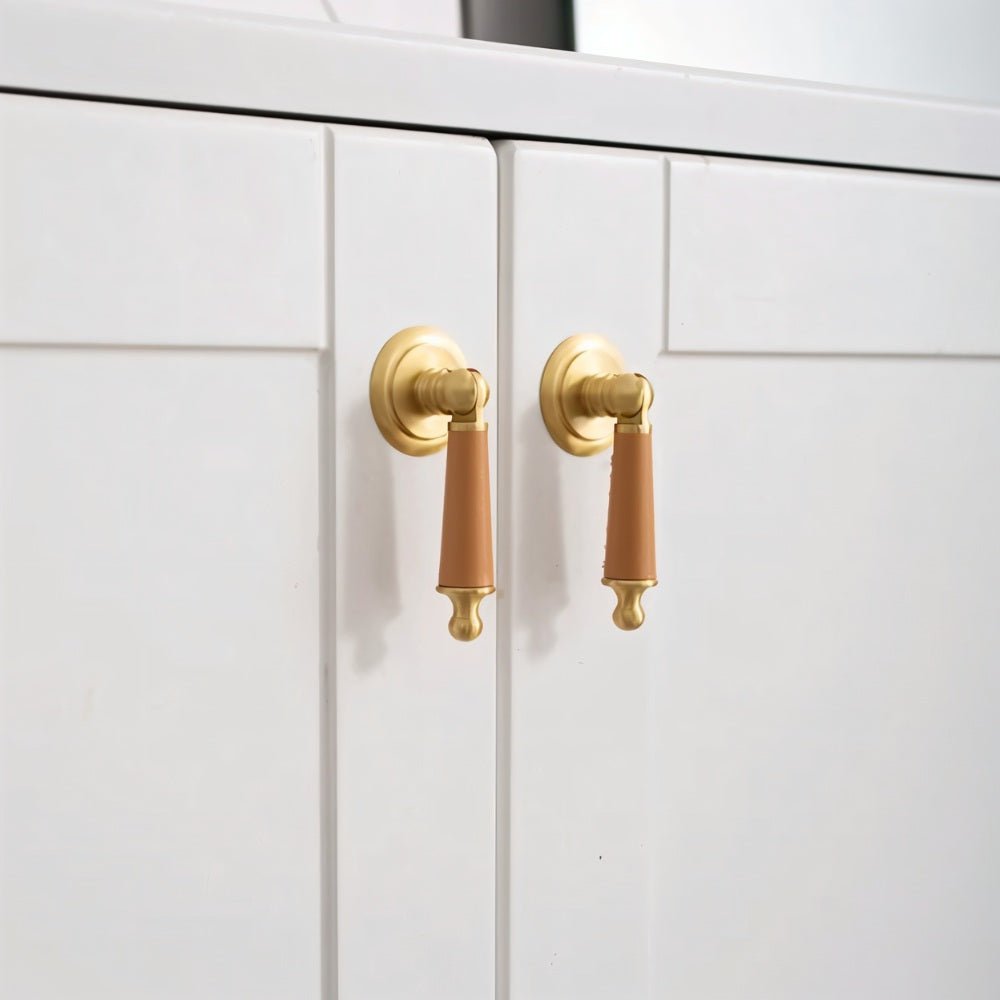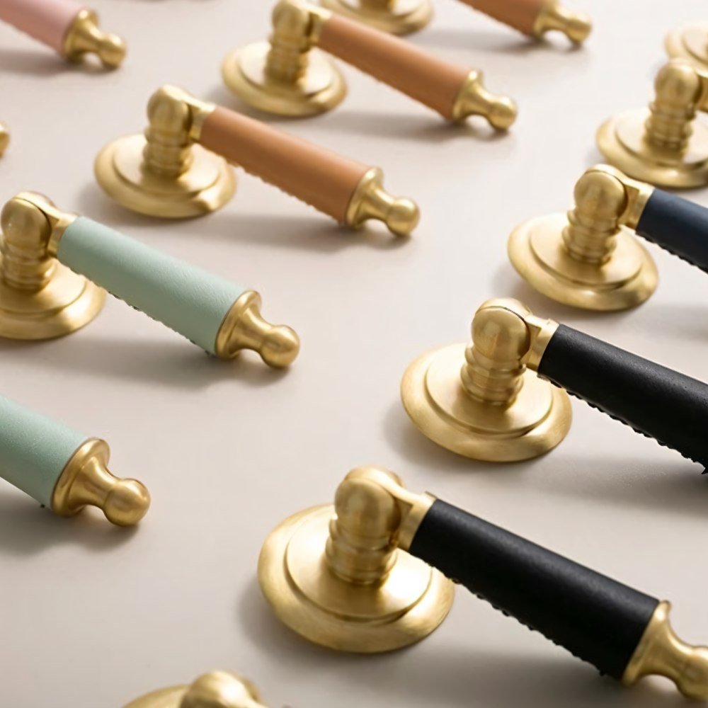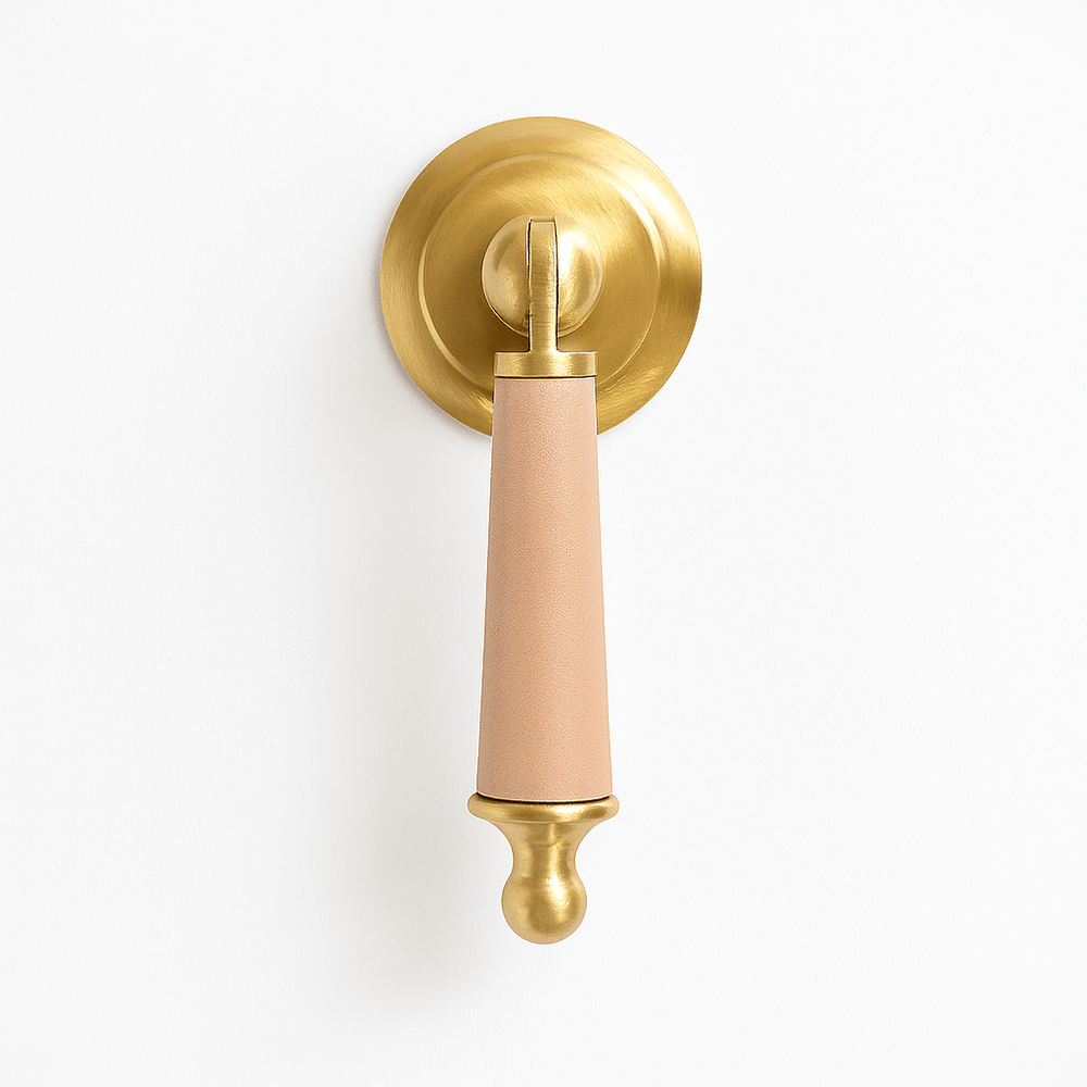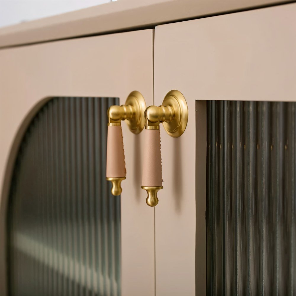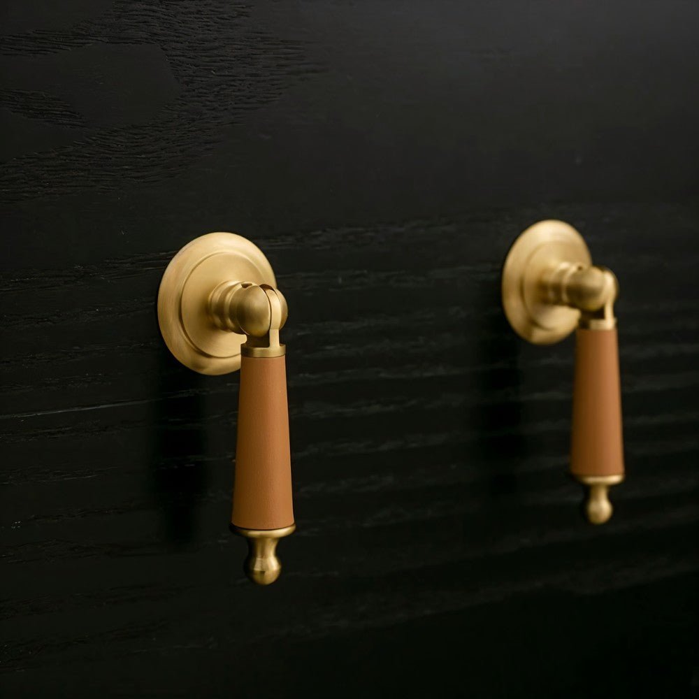 Solid brass and cowhide knob offers a comfortable grip and unique elegance — perfect for enhancing any room with a touch of individuality.