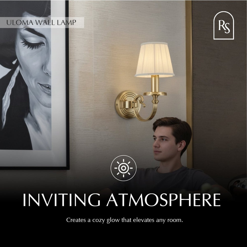 The Uloma Wall Lamp is a refined light fixture crafted from durable copper paired with a pleated cloth lampshade, offering a soft, ambient glow. Its curved arm design and gold finish create an elegant silhouette ideal for classic or transitional interiors. Whether styled alone or in pairs, it adds symmetry and charm to living rooms, bedrooms, or hallways. The structured backplate ensures stable wall mounting and a cohesive aesthetic. Perfect for enhancing upscale décor with both function and style.