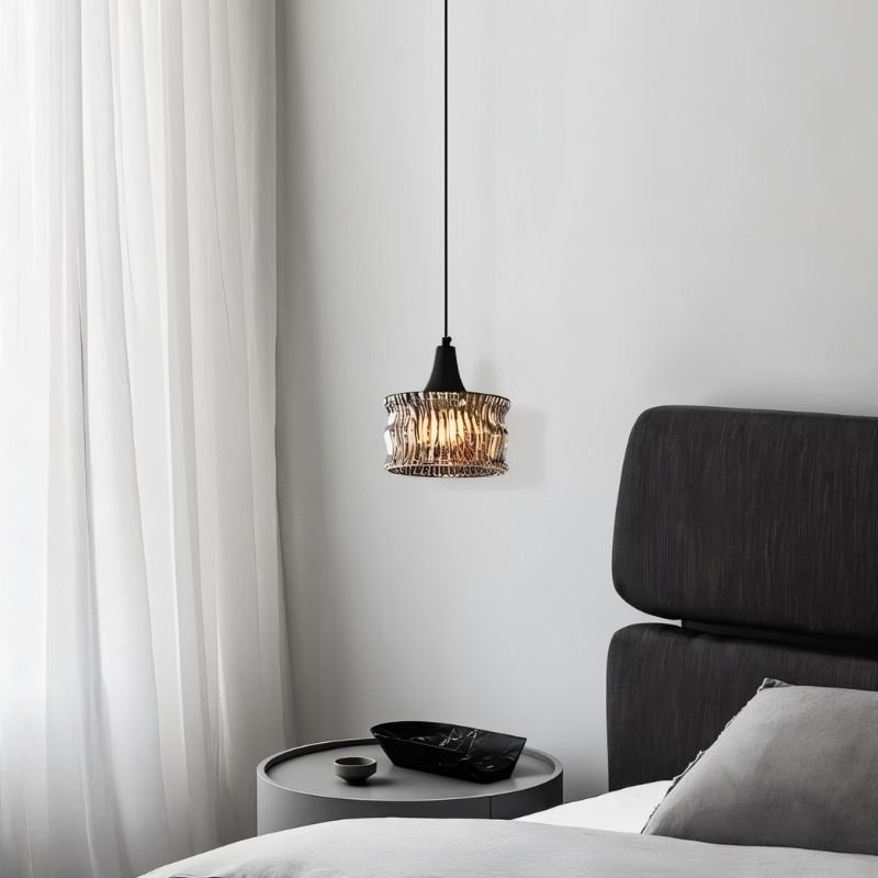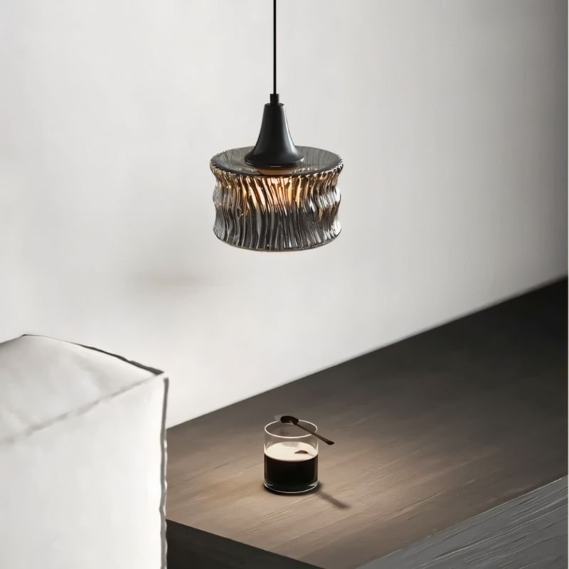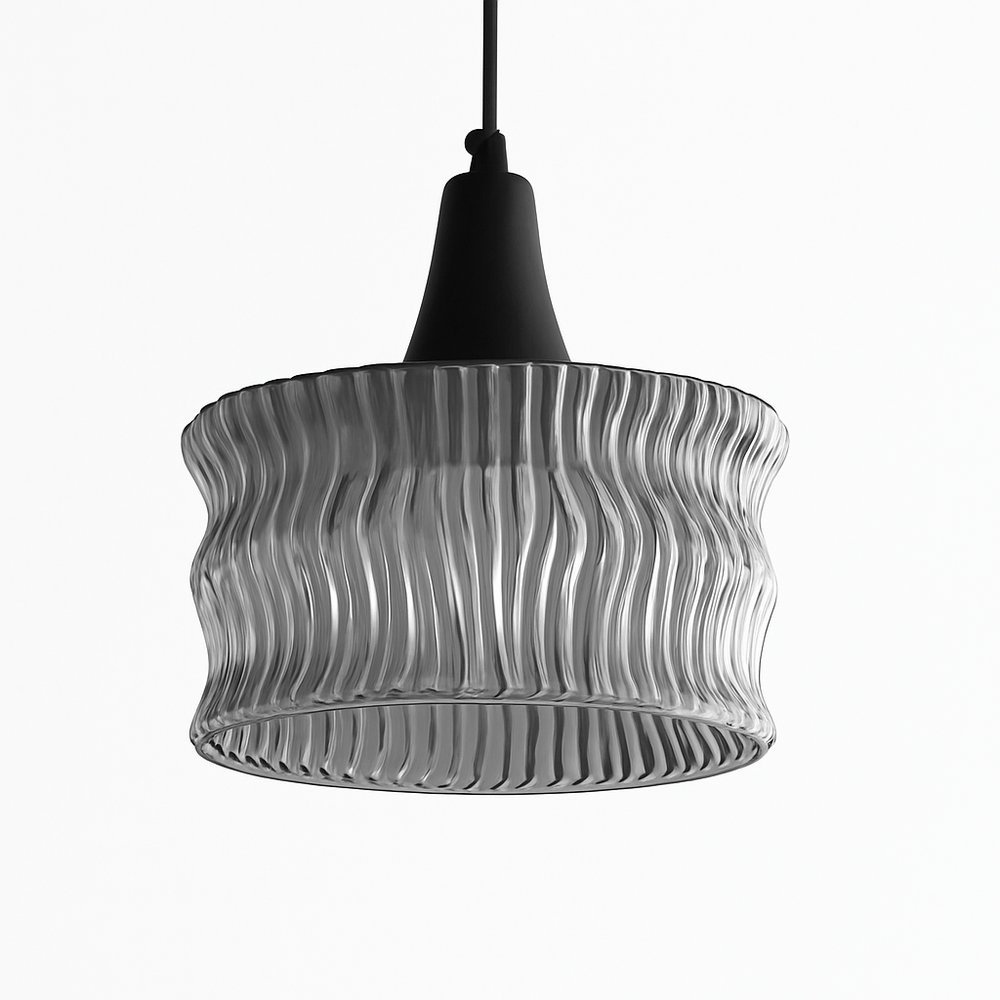 The Velmio Pendant Light features a sculpted glass shade with a rippled texture, creating dynamic light diffusion. Suspended from a slim black cord, its copper and glass construction offers a striking contrast. Ideal for kitchens, dining areas, or modern living spaces, this light fixture adds depth through its patterned illumination. Its compact yet bold design suits single installations or grouped arrangements.