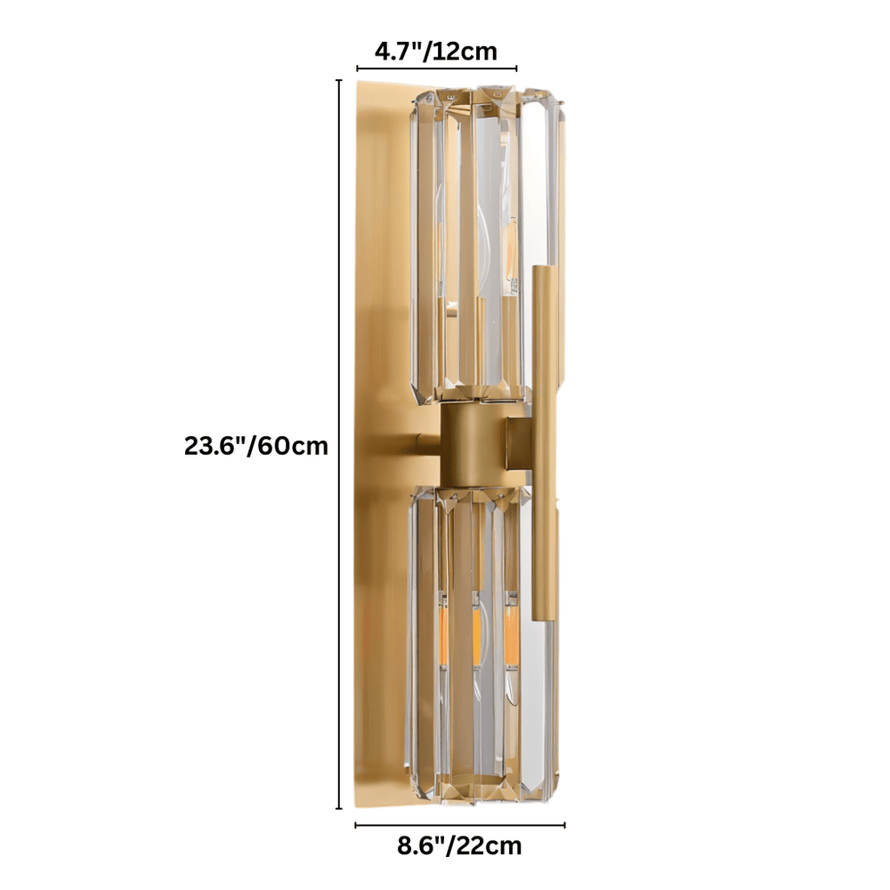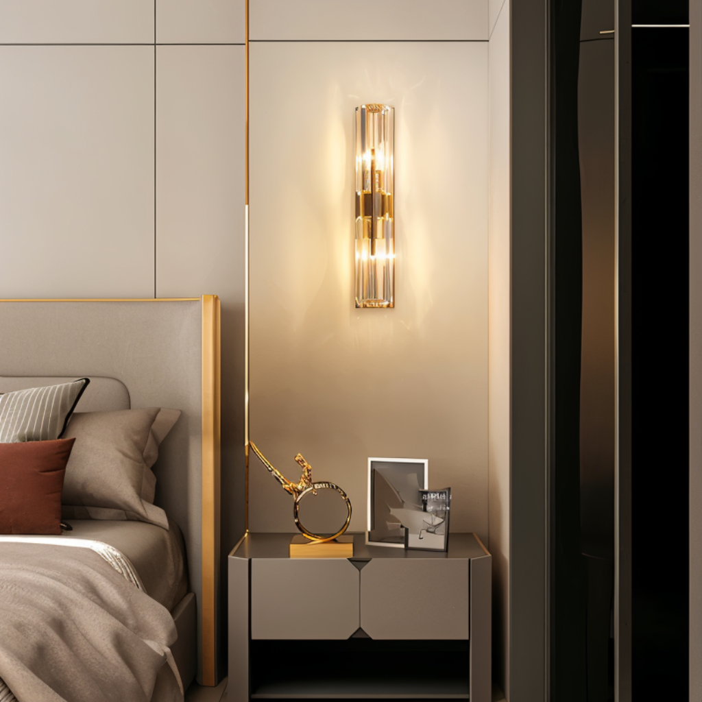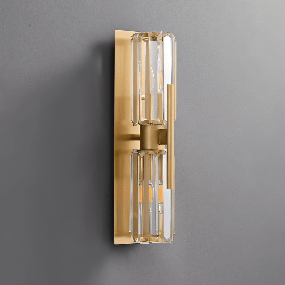 The Vexa Wall Lamp is a copper and crystal light fixture featuring dual vertical crystal cylinders with a central copper structure that enhances both strength and elegance. Its design refracts light through the crystal surfaces, casting layered reflections that add depth and texture to walls. Ideal for hallways, bedrooms, living rooms, or beside mirrors, it combines modern symmetry with a luxurious glow to elevate any interior.