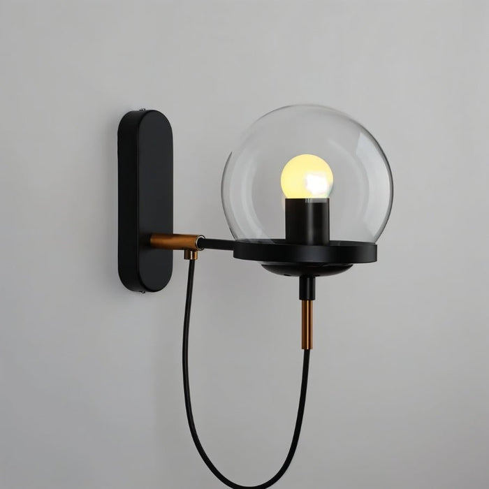 Vintac Wall Lamp features a sleek metal frame in black or brass paired with a smooth spherical glass shade. The minimalist design includes a suspended black cord and a sturdy metal base, making it perfect for adding a modern touch to living rooms, bedrooms, or hallways. The combination of glass and metal materials exudes luxury, while the compact design ensures versatility. This light fixture is an elegant choice for creating an inviting, contemporary ambiance.