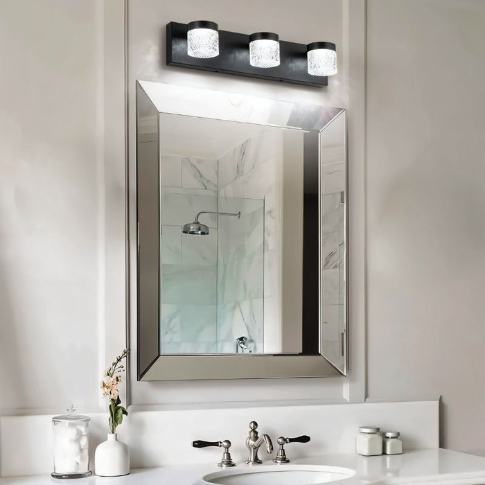 The Vorlen Wall Lamp is a sleek, modern light fixture crafted from aluminum, iron, and acrylic. Its structured design features cylindrical shades with intricate patterns, diffusing soft illumination. Available in 3 and 4-head variations, it is ideal for bathroom vanity mirror lighting, providing balanced brightness. The bold black base contrasts with the luminous shades, adding a refined touch to contemporary spaces. Designed for both functionality and aesthetics, it enhances modern bathrooms with precision lighting.