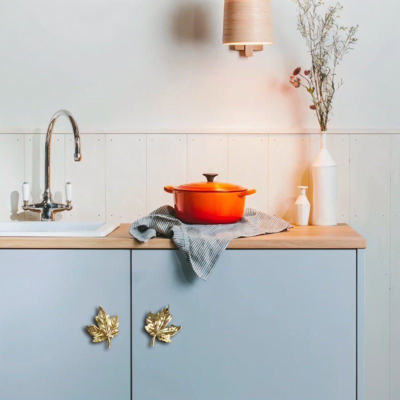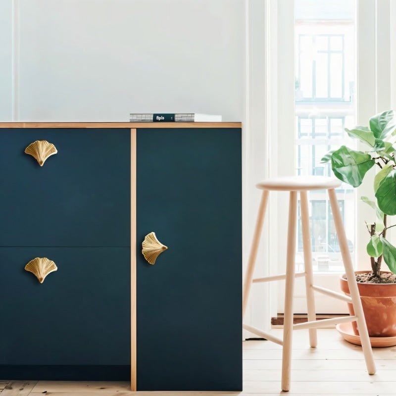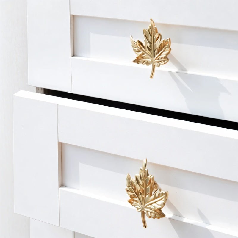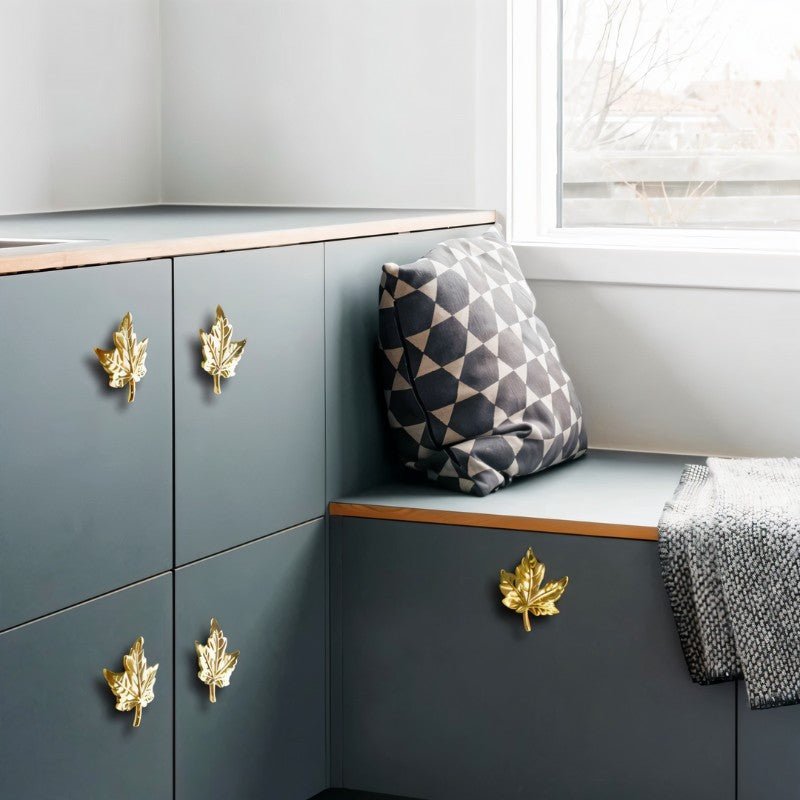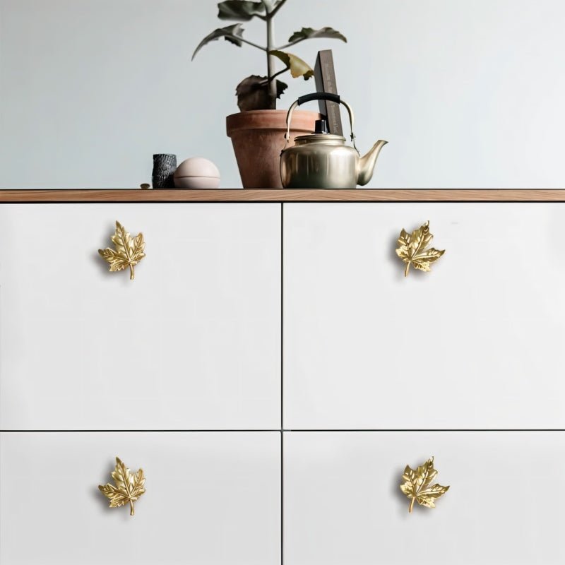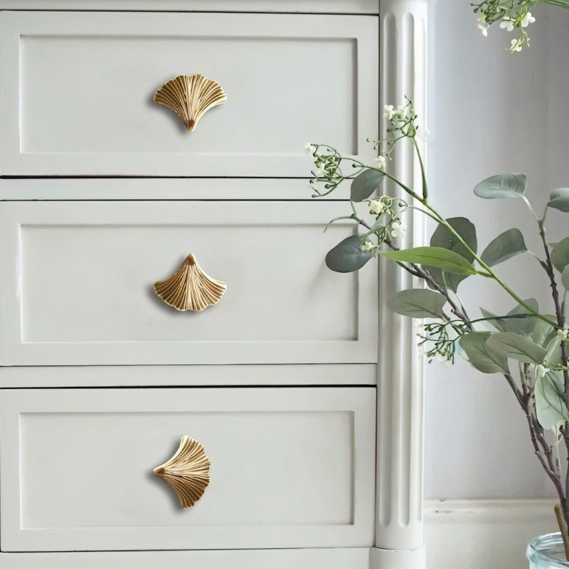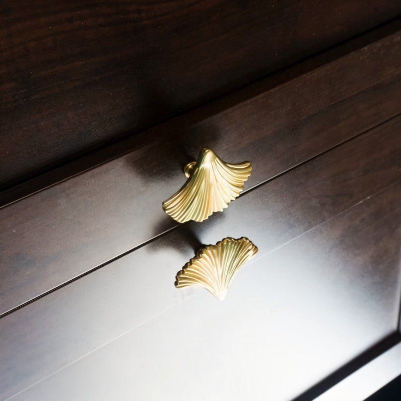 The unique Ginkgo leaf design in lustrous gold adds a touch of elegance, while the solid brass ensures long-lasting quality. These handles bring both visual appeal and comfort to your living spaces.