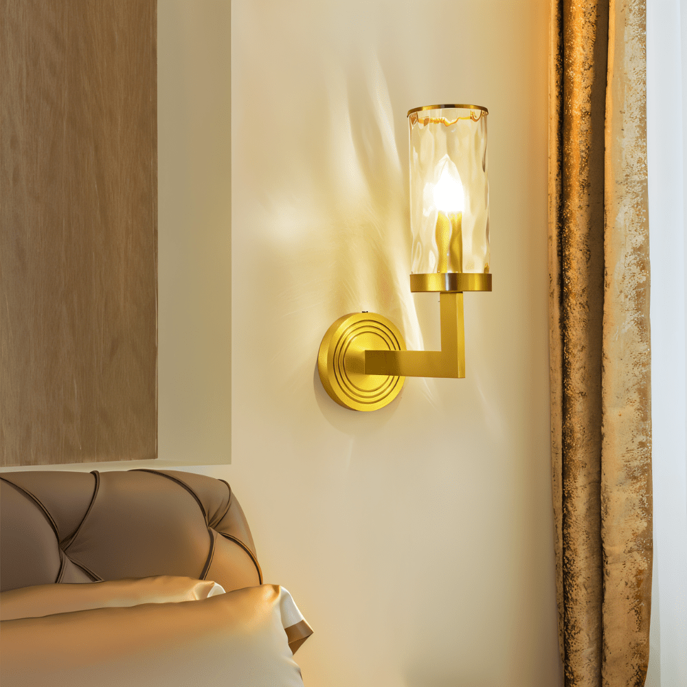 The Wynlo Wall Lamp is a refined light fixture crafted from premium copper and paired with a textured glass lampshade that diffuses light with a warm, ambient glow. Its cylindrical design and ripple-edged glass deliver a sophisticated aesthetic, while the concentric-circle backplate adds modern geometric appeal. The upward-facing bulb within the clear shade enhances vertical lighting dispersion. Ideal for installation in bedrooms, hallways, or upscale living spaces, this wall-mounted light fixture complements both modern and classic interiors. Its minimal projection and elegant finish make it a stylish yet functional décor accent.