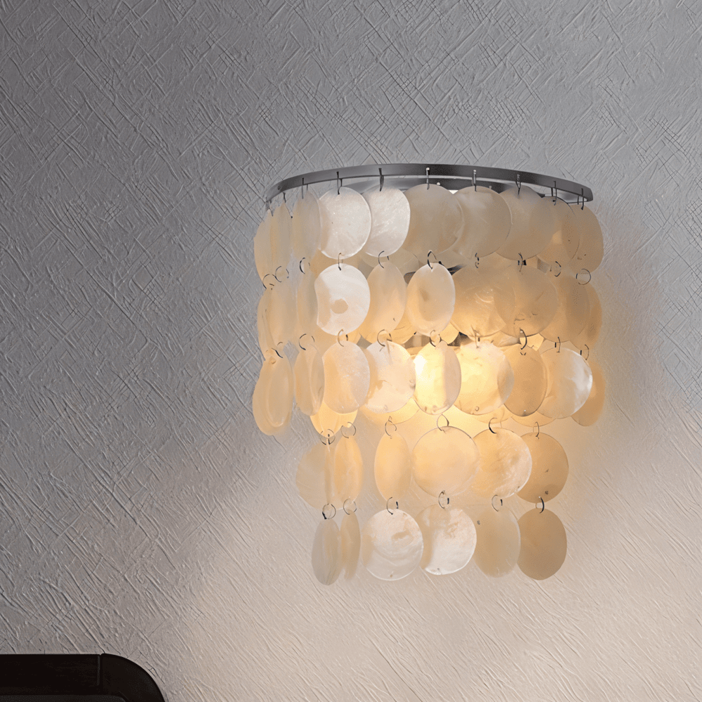 It features a cascading arrangement of translucent shell discs that create a shimmering, layered effect when illuminated.