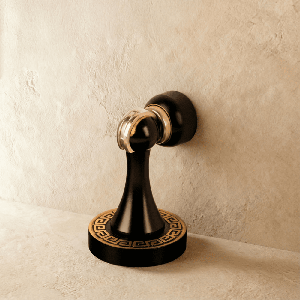 Sculpted brass design with a refined black and gold finish ensures doors stay securely in place while preventing wall damage — perfect for elegant homes and offices.