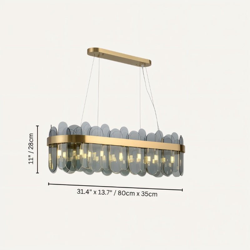 Le lustre Ailine , avec son savoir-faire et son design uniques, confère une touche de luxe et d'élégance moderne à n'importe quelle pièce. Il présente une finition dorée brillante et est découpé avec précision et de forme ovale à partir de feuilles de verre dépoli. Les pendentifs qui ressemblent à des bâtons suspendus accrochés au cadre lui confèrent une esthétique design qui donne un éclat fantastique à n'importe quelle pièce. Ailine convient à tout projet d'hospitalité ou résidentiel luxueux, respirant l'élégance et la qualité avec une touche naturelle, créant un environnement magnifique partout où il est utilisé.