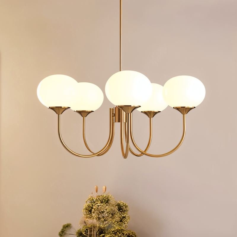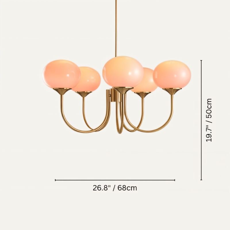 The Amelia Chandelier's gold-finished frame and glass shades in peachy pink or white create a diffused, ambient light that provides a warm, accentuated radiance, enhancing the room's ambiance with a classic, enchanting look.