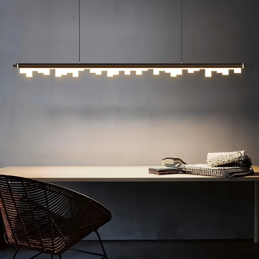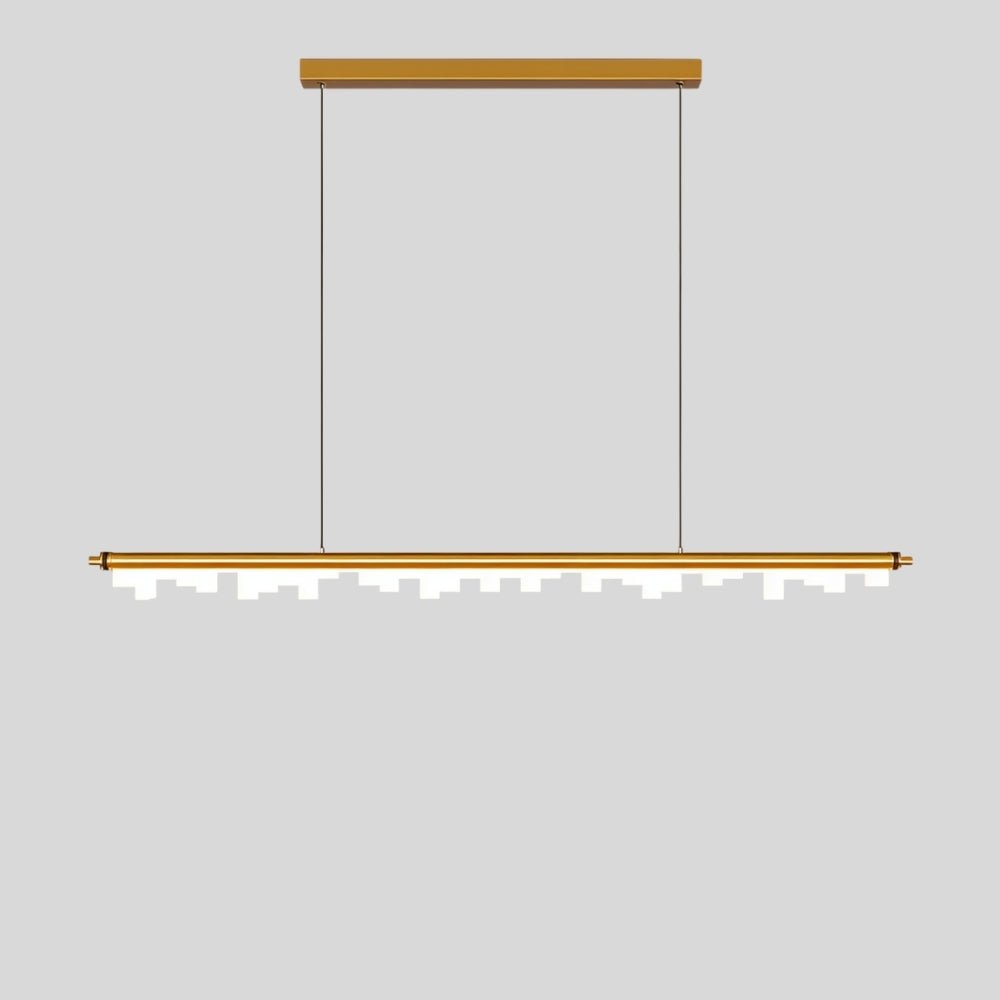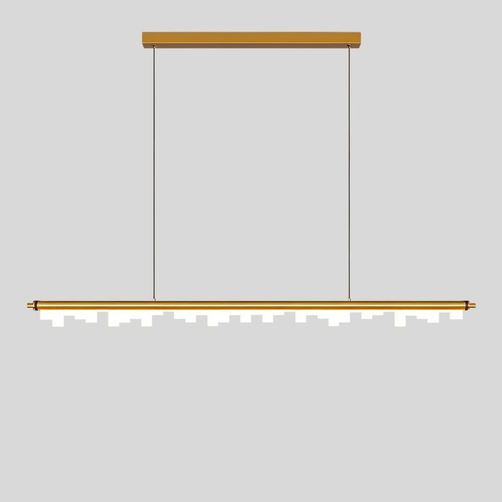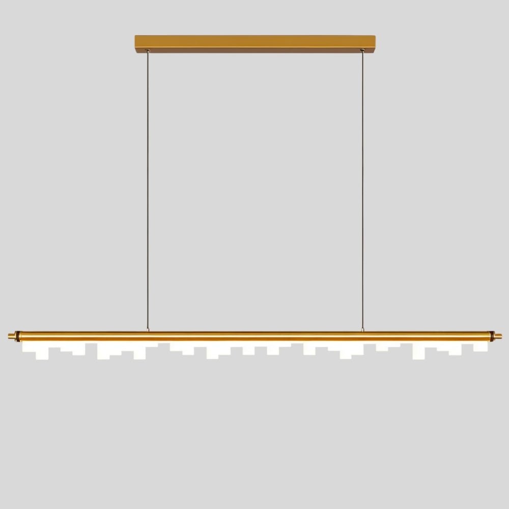 The Arias Pendant Light features a sleek aluminum frame with geometric acrylic diffusers, creating a dynamic skyline-inspired design. Its linear structure provides even illumination, making it ideal for dining tables, kitchen islands, and contemporary interiors. Crafted from premium materials, it blends modern aesthetics with functional elegance.