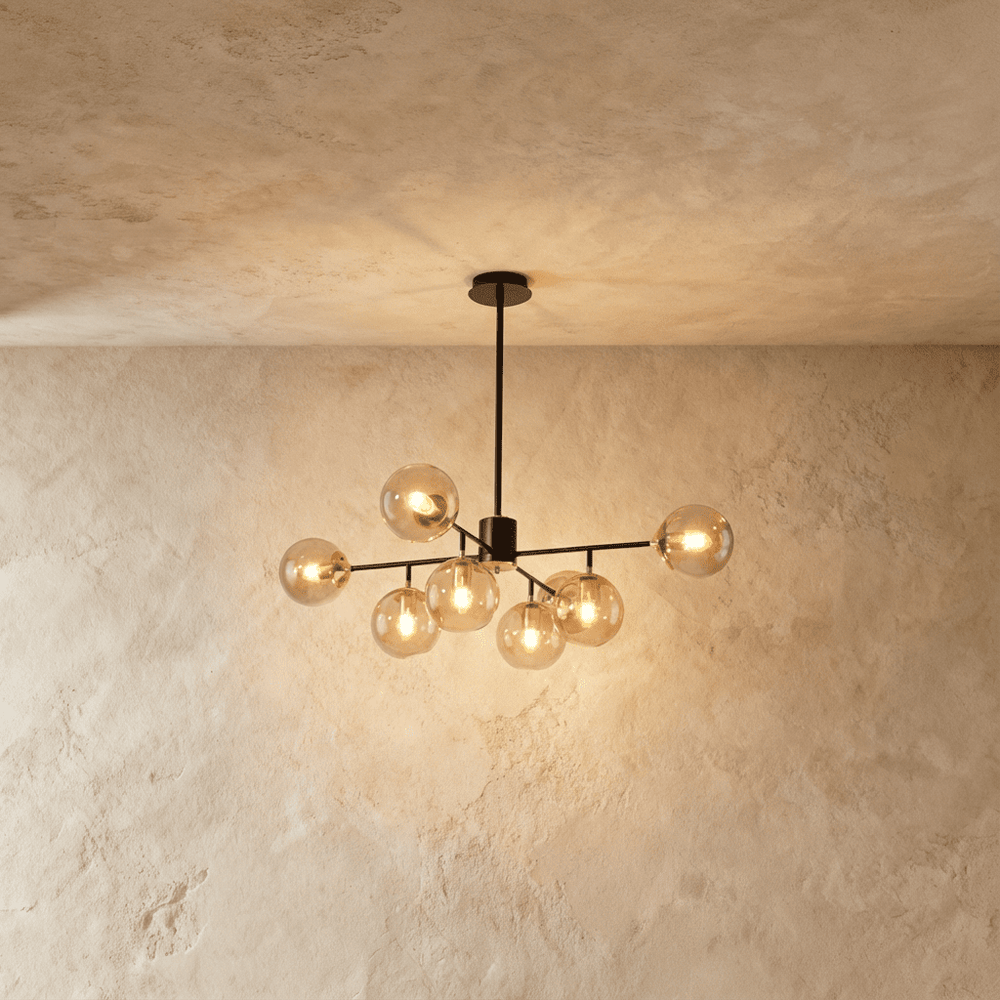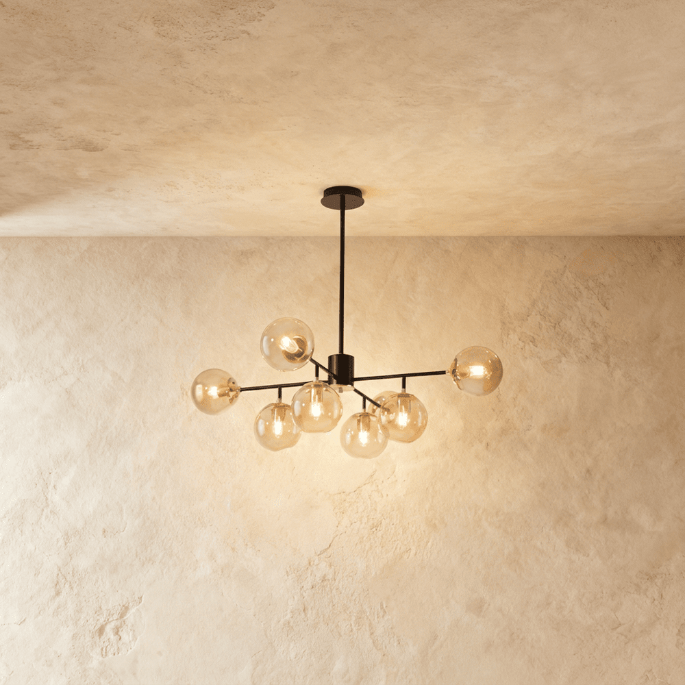 The Camilla Chandelier is not just a lighting fixture; it is an artistic expression that emanates an elegant aura. It features an iron body and blown glass accents that exude modern opulence, perfectly complementing any decor. It boasts an appealing design and an eye-catching form that is sure to leave all your guests in awe.Its presence instantly adds a touch of sophistication and charm to living room or bedrooms, making Camilla the perfect centerpiece for your home.