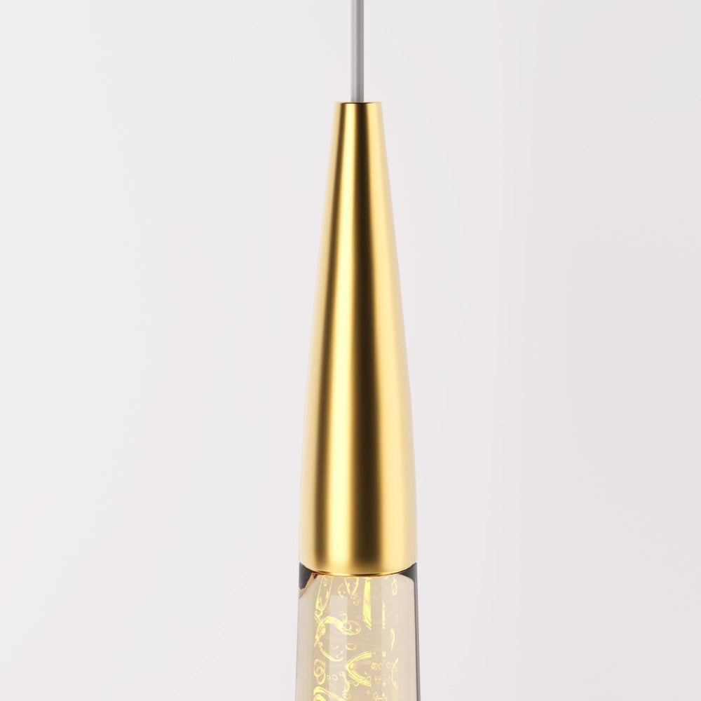 The Chryseos Pendant Light features a crystal bottom and a gold-plated aluminum exterior with integrated LEDs that give it life and radiate light through the shade to produce the ethereal impression of a falling gold droplet to create a calming yet luxurious ambiance. Its contemporary style gives each light fixture depth, allowing you to pair several together to make distinctive accent pieces. You may use the Chryseos to give your living room, lobby, or even bedrooms a sophisticated feel.