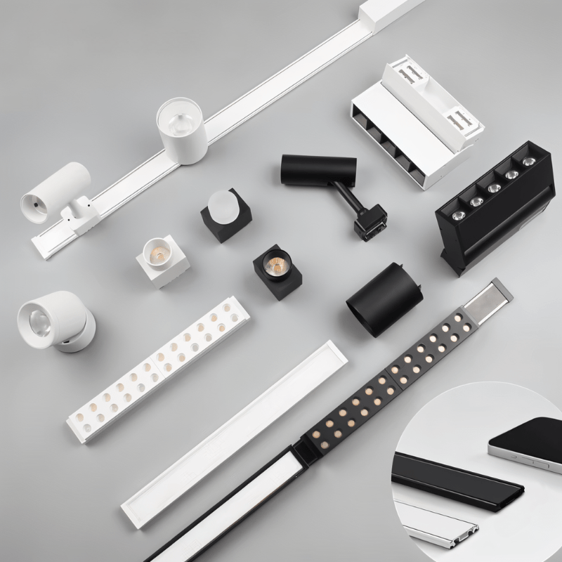 It’s a fully customizable modular lighting system. You can build your own setup by choosing track lengths, connectors, and light types to suit any space.