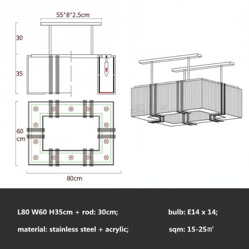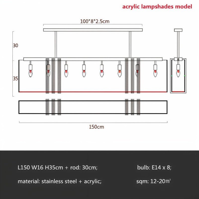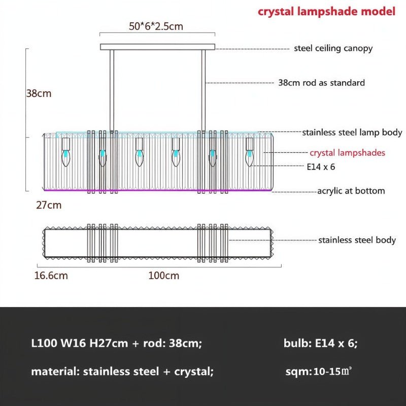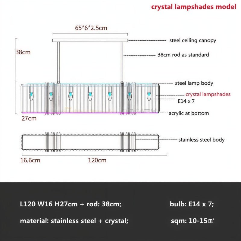 Weight: 22 - 44 lbs (10 - 20 kg) Material: Crystal, Stainless Steel, Acrylic Finish: Gold Light Source: LED Light Bulb (replaceable) Bulb Included: No Number of Bulbs: 18 Bulb Base: E14 Dimmable: Upon Request Voltage: 90-260VAC Installation Type: Hardwired Chain/Cord Length: Up to 15.7 Inches (40cm) Canopy/Backplate Dimensions: 23.6"(60cm) x 3.1"(7.8cm) x 1"(2.5cm) Sloped Ceiling Compatible?: Upon Request Certifications: UL, CCC, CE, CQC, EMC, FCC, GS, LVD, PSE, ROHS, SAA, and VDE