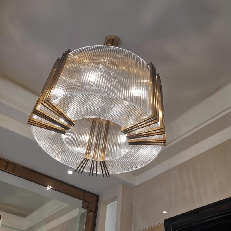 The Destello Chandelier complements various decor styles by blending elegance and modernism with its gold-plated metal frame, acrylic and crystal shades, and energy-saving LED lights, adding a touch of old Hollywood glitz and exotic refinement to any room.