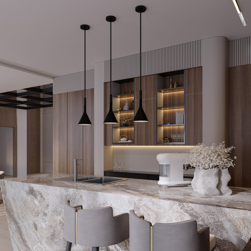 Sleek pendant lights above the island provide focused lighting and complement the design.