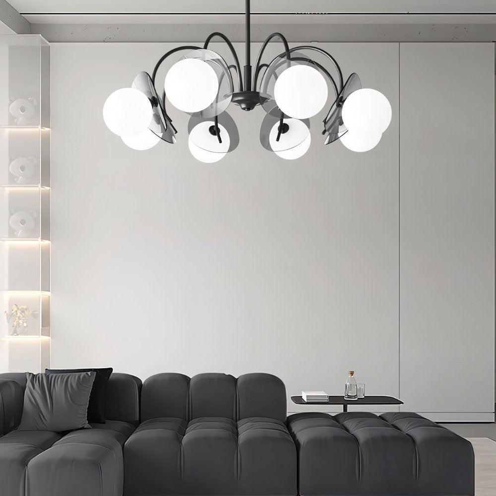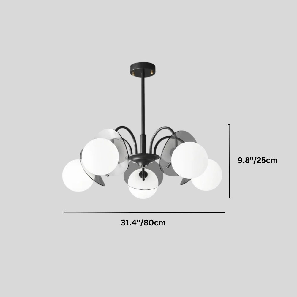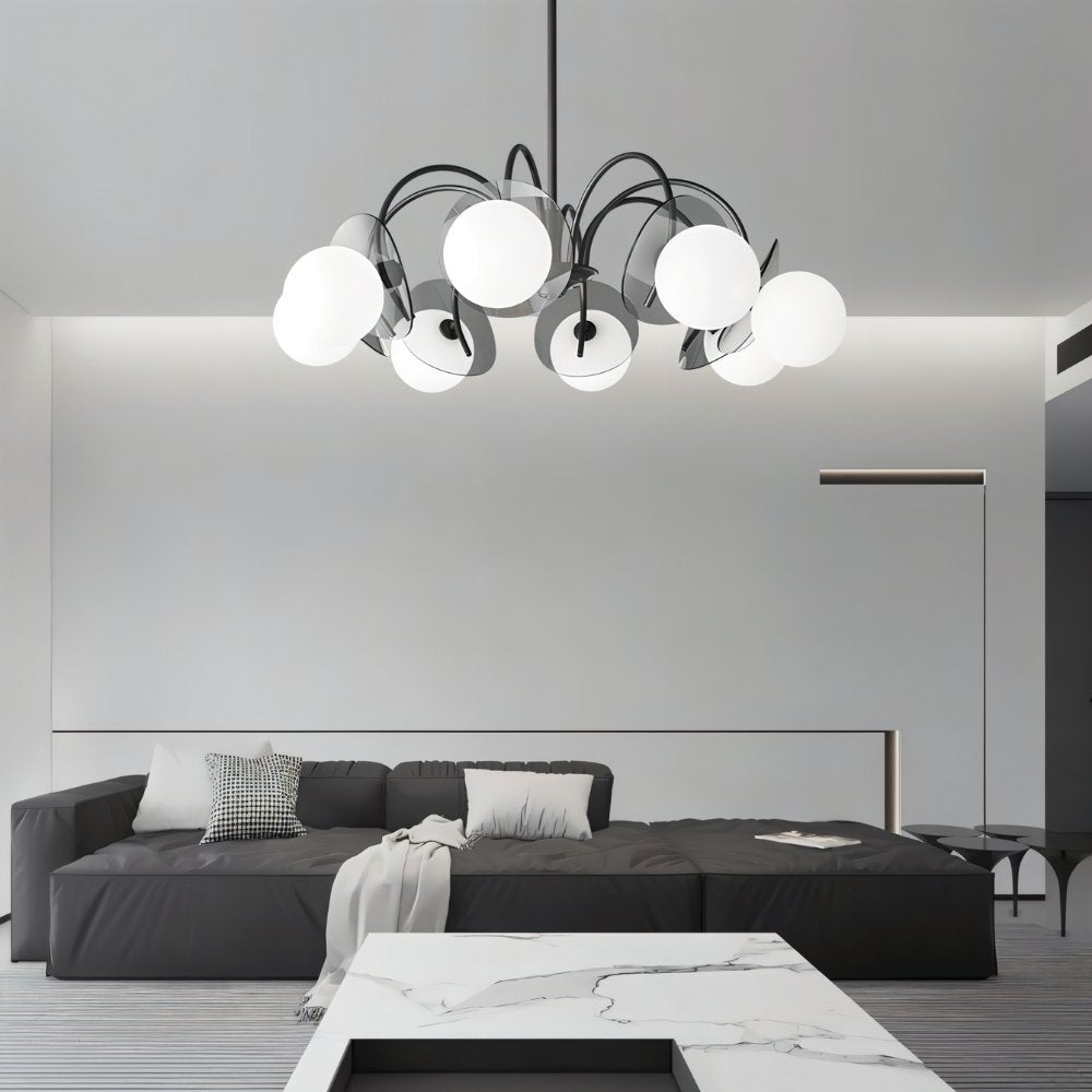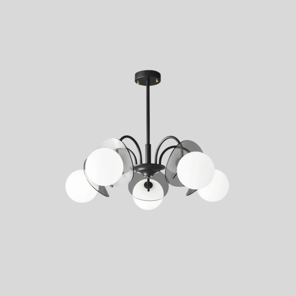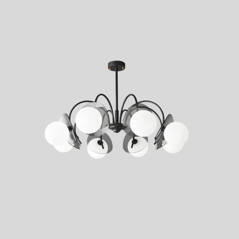 The Dyana chandelier features a sculptural copper frame with gracefully curved arms supporting frosted glass globes. This striking light fixture blends classic and modern aesthetics, creating an elegant focal point. Ideal for dining rooms, kitchens, or entryways, it casts a soft, diffused glow while enhancing the sophistication of any interior.