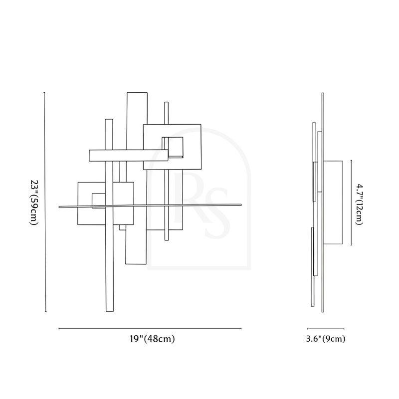 The Eithne Wall Lamp features a bold, geometric structure crafted from iron resulting in strength with artistic precision. This light fixture showcases intersecting linear and square forms that create a layered architectural design. The soft backlit glow highlights its structure, producing elegant light and shadow interplay. Perfect for bedrooms, living rooms, hallways, or contemporary gallery-style interiors, this wall lamp transforms any wall into a statement of modern sophistication and sculptural balance