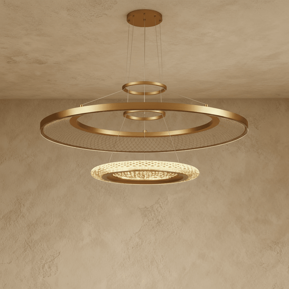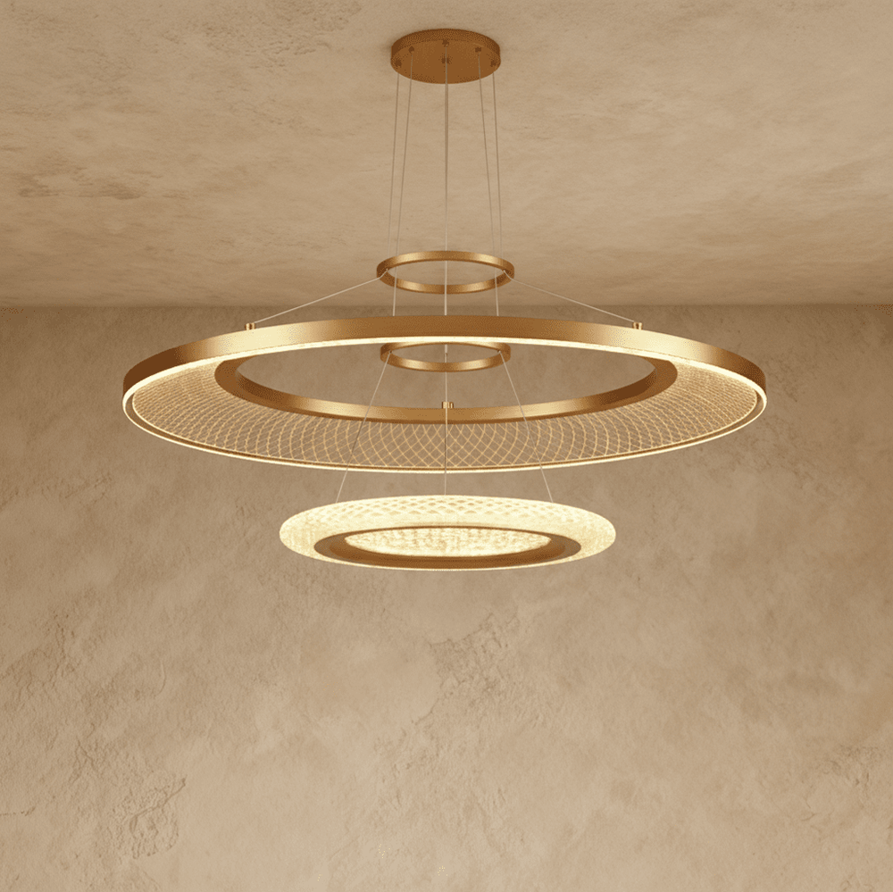 The Eleanora Chandelier is a contemporary masterpiece featuring a cascade of overlapping circular frames. Crafted from aluminum, acrylic, and iron, this light fixture emits a warm, diffused glow through intricate geometric patterns. The Eleanora is ideal for modern living rooms, foyers, or dining rooms, making a striking statement and adding a touch of luxury to any space.