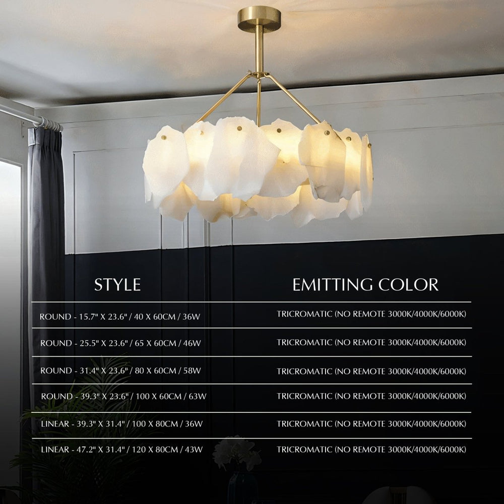 The Elora Chandelier is crafted from premium copper and alabaster. The copper frame lends durability and a warm metallic glow, while the alabaster lampshades provide a natural diffusion of light with their irregular contours.