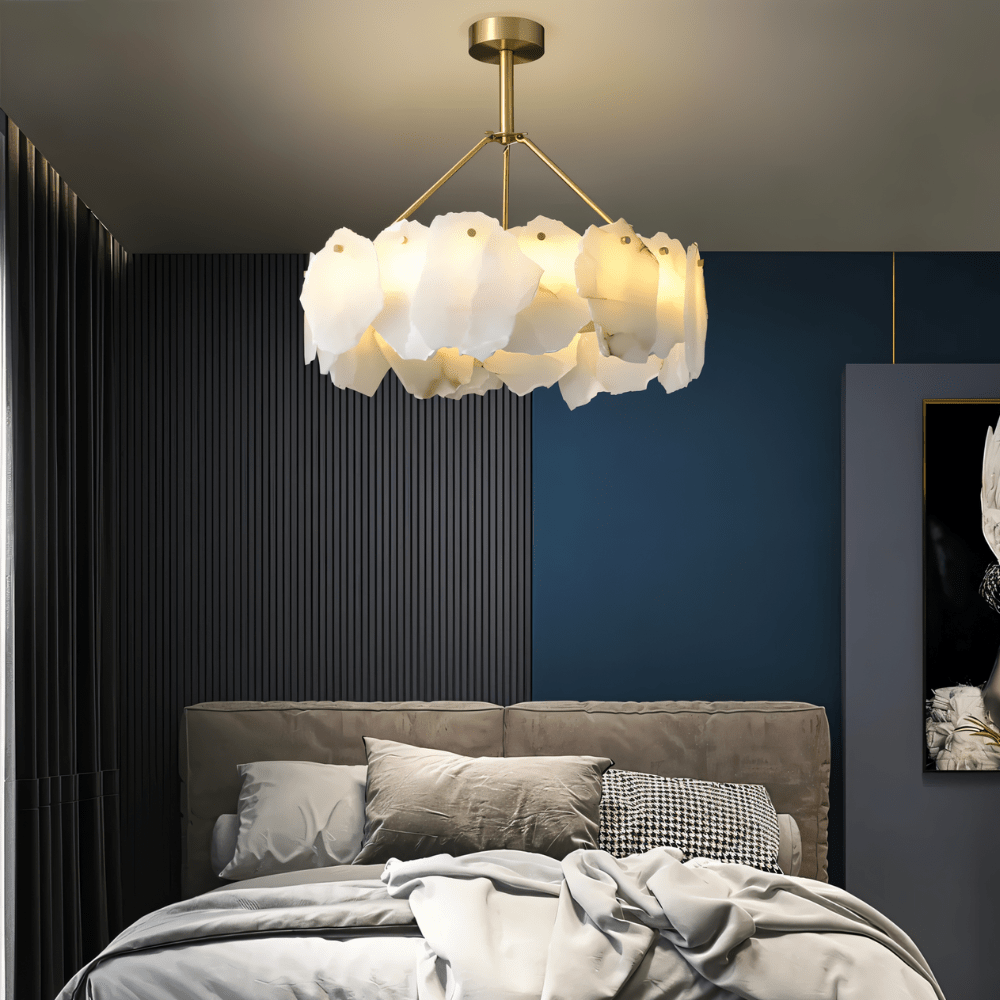 Marble petals diffuse light with sculptural elegance, creating both mood and beauty.