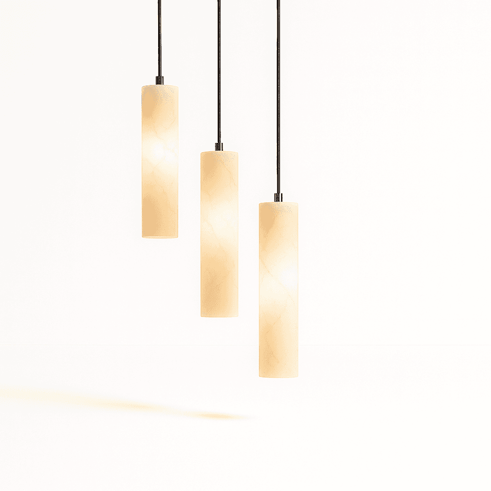 The Entokei Alabaster Chandelier Light showcases a minimalist design with a pair of elegant alabaster marble cylinders suspended from iron cords. This modern light fixture emits a soft, warm glow, creating a serene and inviting ambiance. The Entokei is perfect for contemporary bedrooms, dining rooms, or living spaces, adding a touch of sophistication and a unique focal point to your interior.
