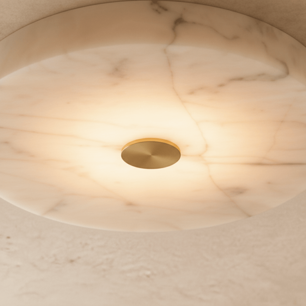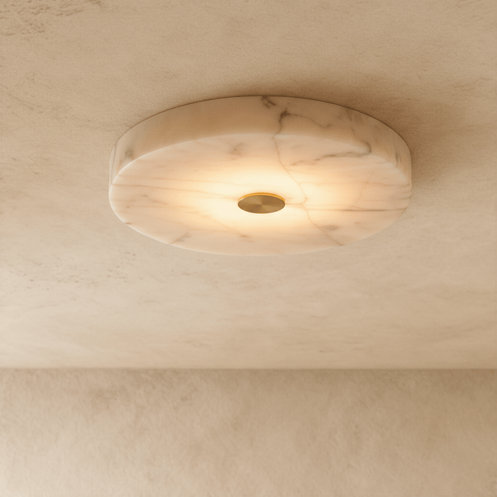 The Gaba Alabaster Ceiling Light features a circular alabaster marble shade that diffuses soft, inviting light. Its naturally veined surface creates a warm glow, while a central copper accent adds a subtle metallic touch. This minimalist design highlights the beauty of natural stone, making it a perfect blend of elegance and simplicity for a hallway, bathroom, or bedroom.
